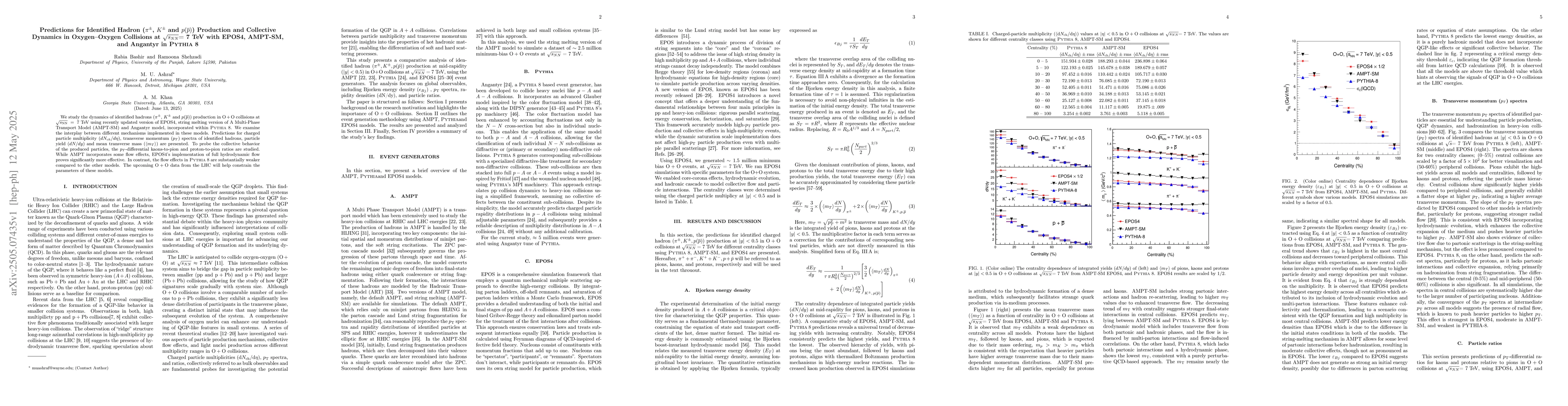 The paper presents detailed predictions from EPOS4, AMPT-SM, and Angantyr models within Pythia 8 for identified hadron production in $O+O$ collisions, highlighting differences in flow implementation and effects.