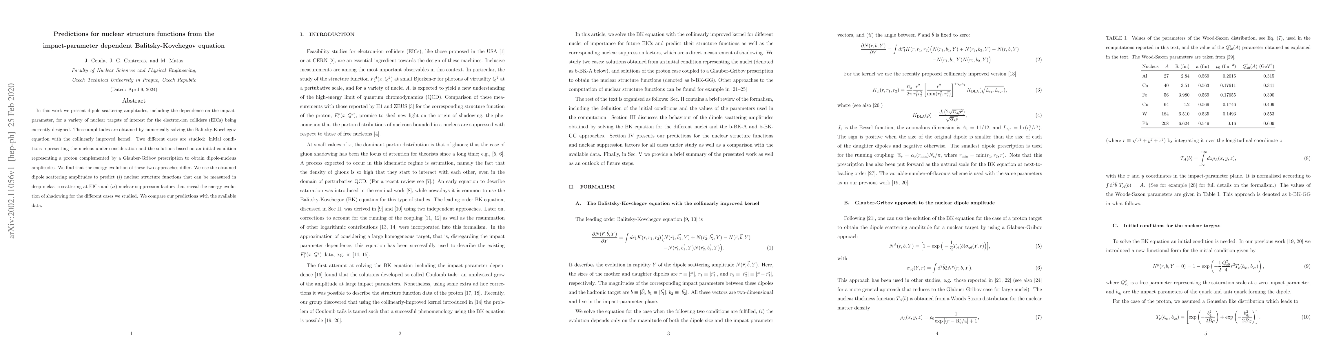 This paper predicts nuclear structure functions and nuclear suppression factors using the impact-parameter dependent Balitsky-Kovchegov equation. It compares dipole scattering amplitudes for various nuclear targets, finding differing energy evolutions between approaches using nuclear and proton initial conditions.