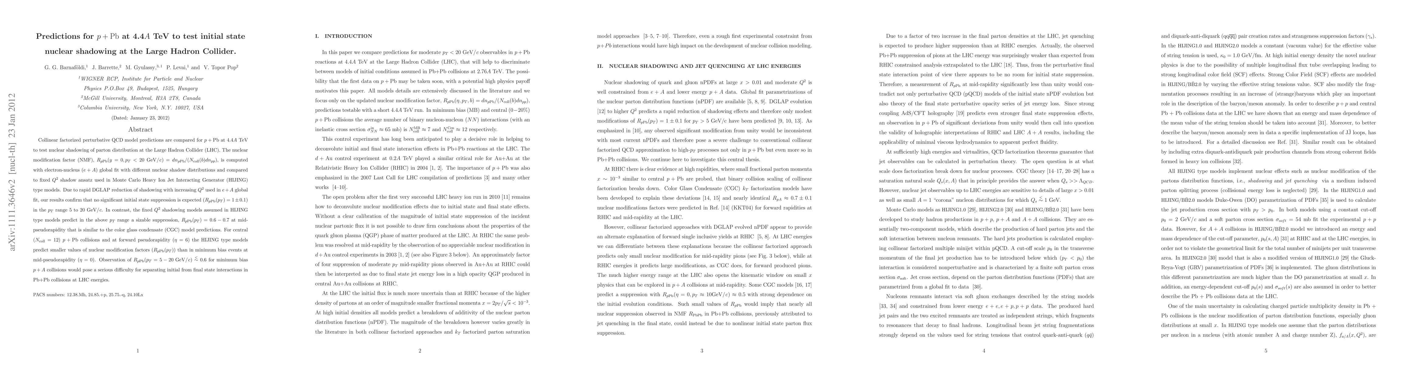 Collinear factorized perturbative QCD model predictions are compared for p+Pb at 4.4A TeV to test nuclear shadowing of parton distribution at the Large Hadron Collider (LHC). The nuclear modification factor (NMF), R_{pPb}(y=0,p_T<20 GeV/c) = dn_{p Pb} /(N_{coll}(b)dn_{pp}), is computed with electron-nucleus (e+A) global fit with different nuclear shadow distributions and compared to fixed Q^2 shadow ansatz used in Monte Carlo Heavy Ion Jet Interacting Generator (HIJING) type models. Due to rapid DGLAP reduction of shadowing with increasing Q^2 used in e+A global fit, our results confirm that no significant initial state suppression is expected (R_{pPb} (p_T) = 1 \pm 0.1) in the p_T range 5 to 20 GeV/ c. In contrast, the fixed Q^2 shadowing models assumed in HIJING type models predict in the above p_T range a sizable suppression, R_{pPb} (p_T) = 0.6-0.7 at mid-pseudorapidity that is similar to the color glass condensate (CGC) model predictions. For central (N_{coll} = 12) p+ Pb collisions and at forward pseudorapidity (\eta = 6) the HIJING type models predict smaller values of nuclear modification factors (R_{pPb}(p_T)) than in minimum bias events at mid-pseudorapidity (\eta = 0). Observation of R_{pPb}(p_T= 5-20 GeV/c) less than 0.6 for minimum bias p+A collisions would pose a serious difficulty for separating initial from final state interactions in Pb+Pb collisions at LHC energies.