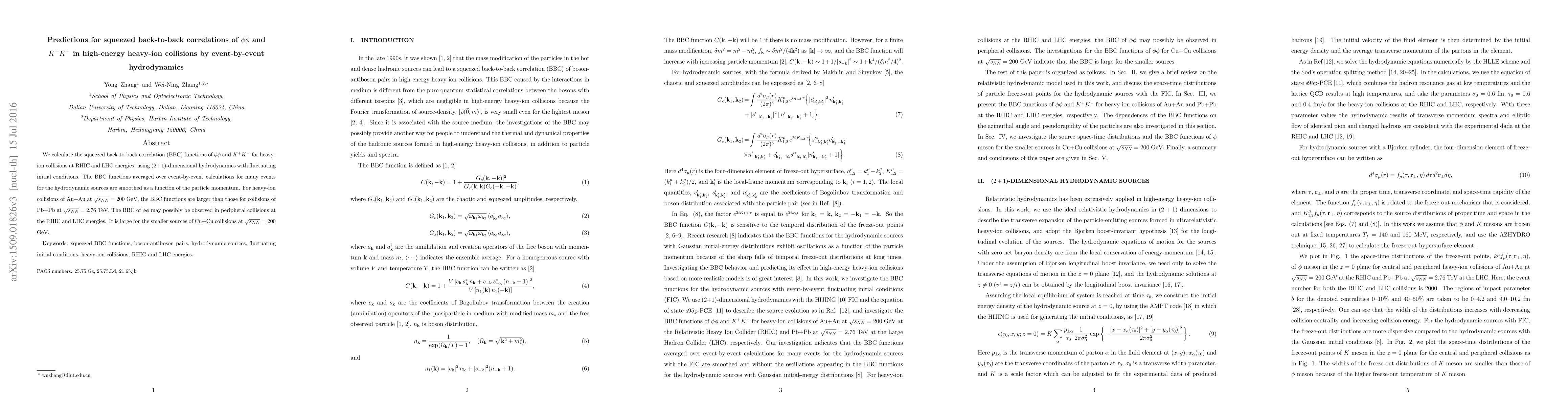 This paper investigates squeezed back-to-back correlation functions of $\phi\phi$ and $K^+K^-$ pairs in high-energy heavy-ion collisions using event-by-event hydrodynamics. The study finds that BBC functions are larger for smaller collision systems like Au+Au and Cu+Cu compared to larger systems like Pb+Pb.