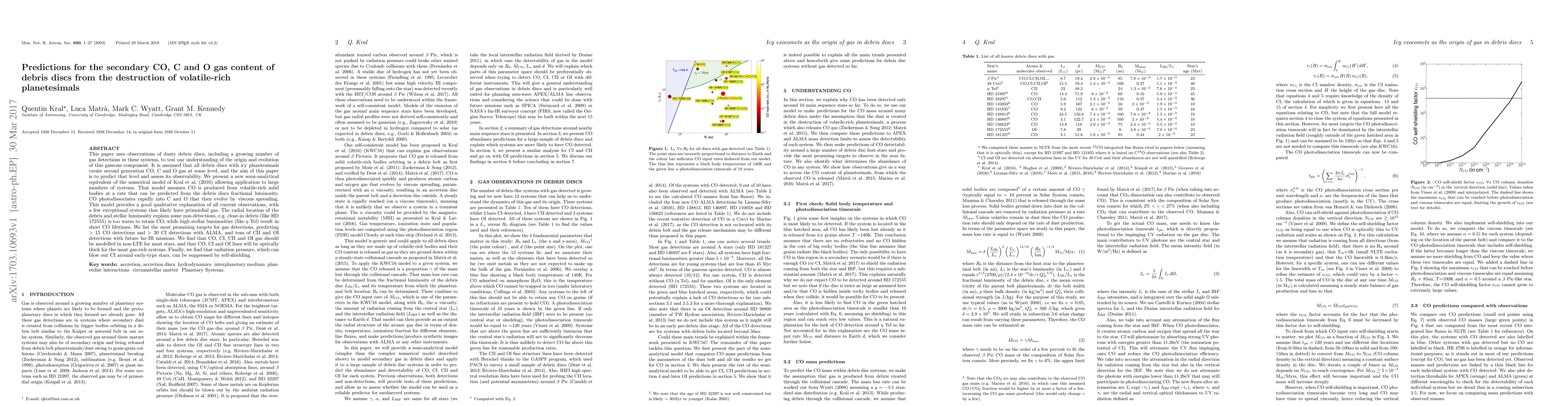 This paper predicts secondary CO, C, and O gas content in debris discs from the destruction of volatile-rich planetesimals, using a semi-analytical model. It identifies promising targets for gas detections, predicting numerous CO and CI detections with ALMA and future far-IR missions.