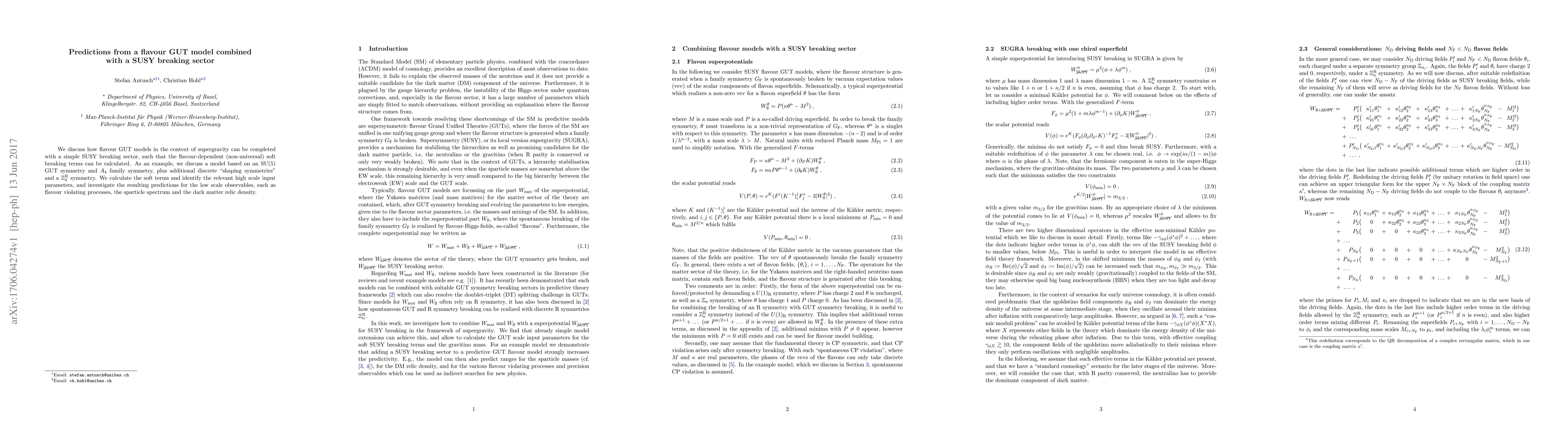 This paper explores how flavour GUT models in supergravity can incorporate a SUSY breaking sector to determine non-universal soft breaking terms. It uses an SU(5) GUT with $A_4$ family symmetry and additional symmetries to calculate these terms, then investigates predictions for low-scale observables like flavour-violating processes and dark matter density.