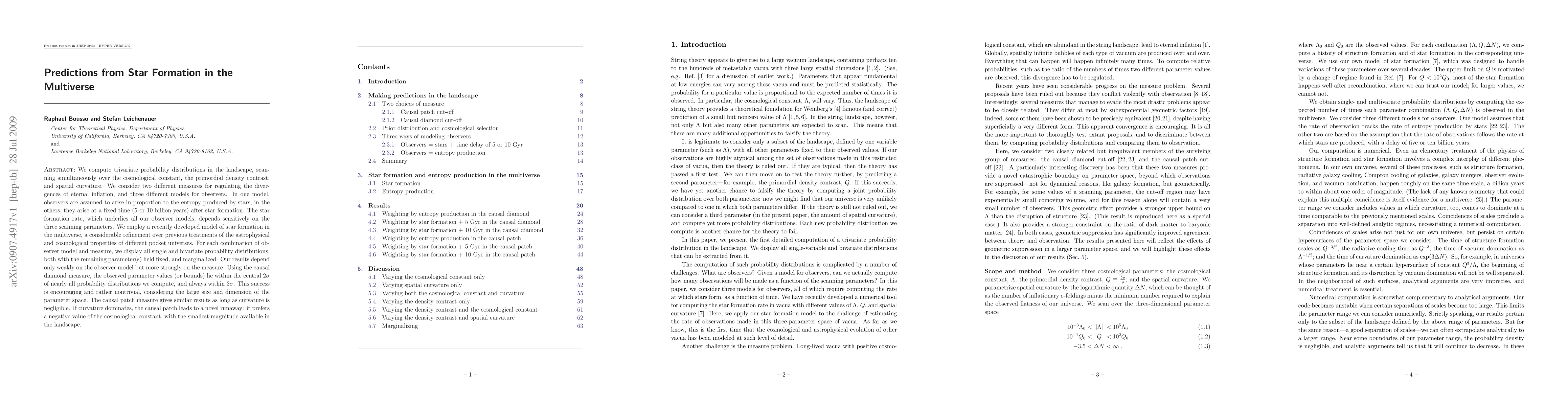 We compute trivariate probability distributions in the landscape, scanning simultaneously over the cosmological constant, the primordial density contrast, and spatial curvature. We consider two different measures for regulating the divergences of eternal inflation, and three different models for observers. In one model, observers are assumed to arise in proportion to the entropy produced by stars; in the others, they arise at a fixed time (5 or 10 billion years) after star formation. The star formation rate, which underlies all our observer models, depends sensitively on the three scanning parameters. We employ a recently developed model of star formation in the multiverse, a considerable refinement over previous treatments of the astrophysical and cosmological properties of different pocket universes. For each combination of observer model and measure, we display all single and bivariate probability distributions, both with the remaining parameter(s) held fixed, and marginalized. Our results depend only weakly on the observer model but more strongly on the measure. Using the causal diamond measure, the observed parameter values (or bounds) lie within the central $2\sigma$ of nearly all probability distributions we compute, and always within $3\sigma$. This success is encouraging and rather nontrivial, considering the large size and dimension of the parameter space. The causal patch measure gives similar results as long as curvature is negligible. If curvature dominates, the causal patch leads to a novel runaway: it prefers a negative value of the cosmological constant, with the smallest magnitude available in the landscape.