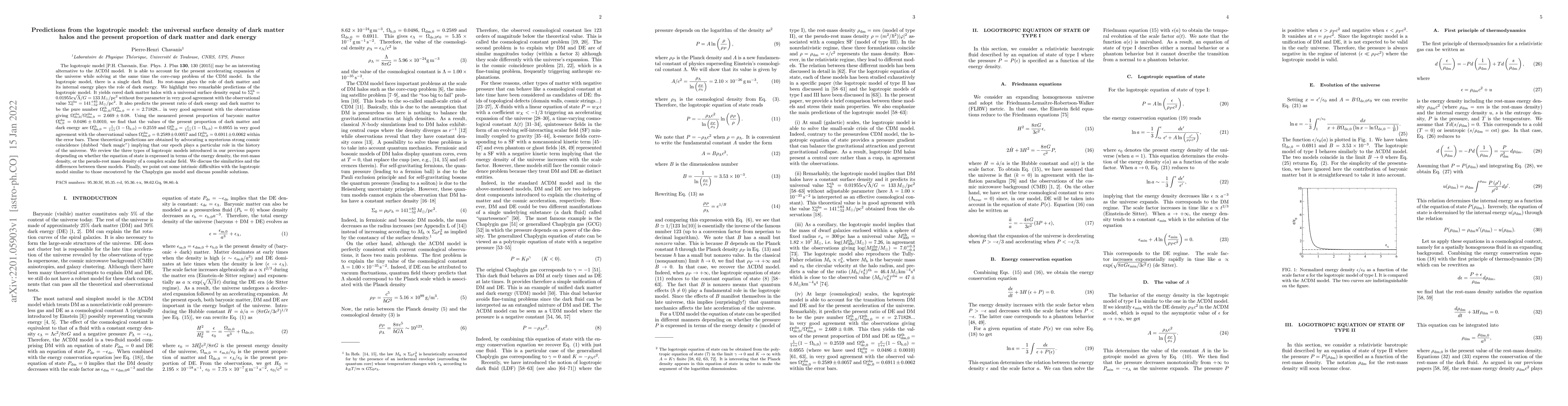 The logotropic model [P.H. Chavanis, Eur. Phys. J. Plus {\bf 130}, 130 (2015)] may be an interesting alternative to the $\Lambda$CDM model. It is able to account for the present accelerating expansion of the universe while solving at the same time the core-cusp problem of the CDM model. In the logotropic model, there is a single dark fluid. Its rest-mass plays the role of dark matter and its internal energy plays the role of dark energy. We highlight two remarkable predictions of the logotropic model. It yields cored dark matter halos with a universal surface density equal to $\Sigma_0^{\rm th}=0.01955 c\sqrt{\Lambda}/G=133\, M_{\odot}/{\rm pc}^2$ without free parameter in very good agreement with the observational value $\Sigma_0^{\rm obs}=141_{-52}^{+83}\, M_{\odot}/{\rm pc}^2$. It also predicts the present ratio of dark energy and dark matter to be the pure number $\Omega_{\rm de,0}^{\rm th}/\Omega_{\rm dm,0}^{\rm th}=e=2.71828...$ in very good agreement with the observations giving $\Omega_{\rm de,0}^{\rm obs}/\Omega_{\rm dm,0}^{\rm obs}=2.669\pm 0.08$. Using the measured present proportion of baryonic matter $\Omega_{\rm b,0}^{\rm obs}=0.0486\pm 0.0010$, we find that the values of the present proportion of dark matter and dark energy are $\Omega_{\rm dm,0}^{\rm th}=\frac{1}{1+e}(1-\Omega_{\rm b,0})=0.2559$ and $\Omega_{\rm de,0}^{\rm th}=\frac{e}{1+e}(1-\Omega_{\rm b,0})=0.6955$ in very good agreement with the observational values $\Omega_{\rm dm,0}^{\rm obs}=0.2589\pm 0.0057$ and $\Omega_{\rm de,0}^{\rm obs}=0.6911\pm 0.0062$ within the error bars. These theoretical predictions are obtained by advocating a mysterious strong cosmic coincidence (dubbed "dark magic") implying that our epoch plays a particular role in the history of the universe.