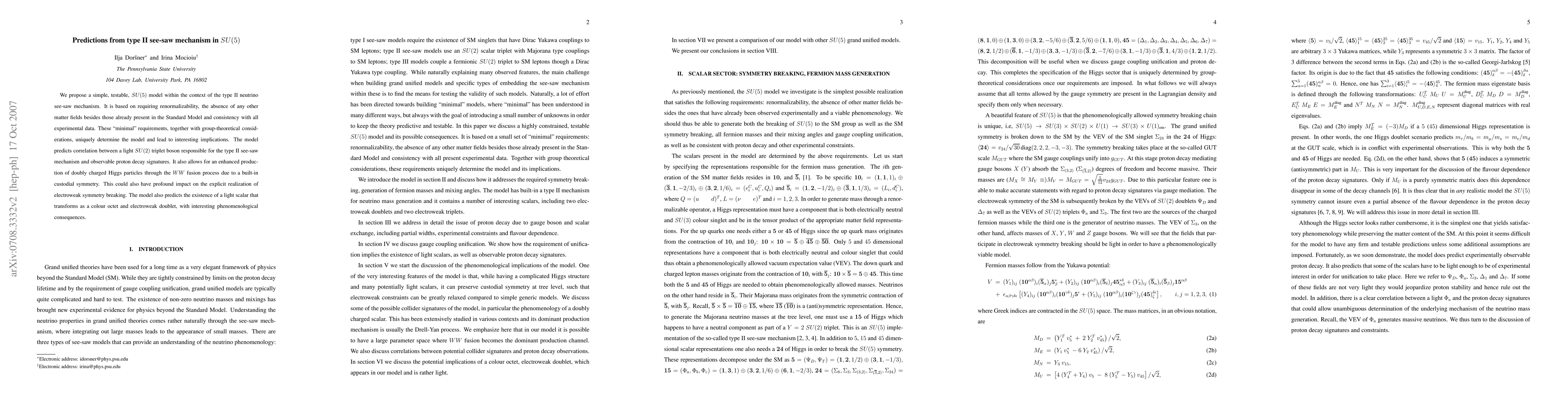 This paper proposes a minimal SU(5) model based on the type II see-saw mechanism, predicting correlations between a light SU(2) triplet boson and proton decay, enhanced production of doubly charged Higgs particles, and a light scalar in a colour octet and electroweak doublet, all consistent with experimental data.