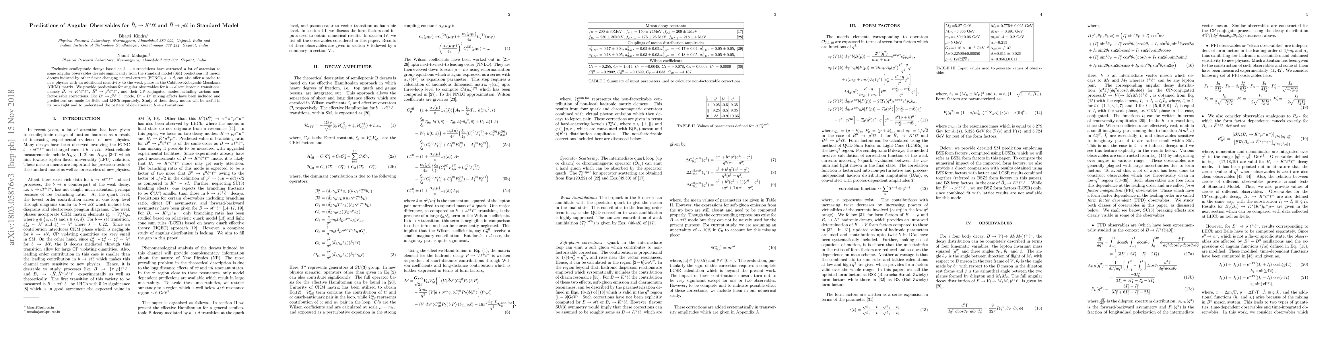 Exclusive semileptonic decays based on $b\to s$ transitions have been attracting a lot of attention as some angular observables deviate significantly from the Standard Model (SM) predictions in specific $q^2$ bins. B meson decays induced by other Flavor Changing Neutral Current (FCNC), $b\to d$, can also offer a probe to new physics with an additional sensitivity to the weak phase in Cabibbo-Kobayashi-Masakawa (CKM) matrix. We provide predictions for angular observables for $b\to d$ semileptonic transitions, namely $\bar{B}_s\to K^{\ast}\ell^+\ell^-$, $\bar{B}^0\to\rho^0 \ell^+\ell^-$, and their CP-conjugated modes. For $\bar{B}^0\to\rho^0 \ell^+\ell^-$ mode, $B^0-\bar{B}^0$ mixing effects have been included and predictions are made for Belle and LHCb separately. Study of these decay modes will be useful in its own right and to understand the pattern of deviations in $b\to s$ transitions.