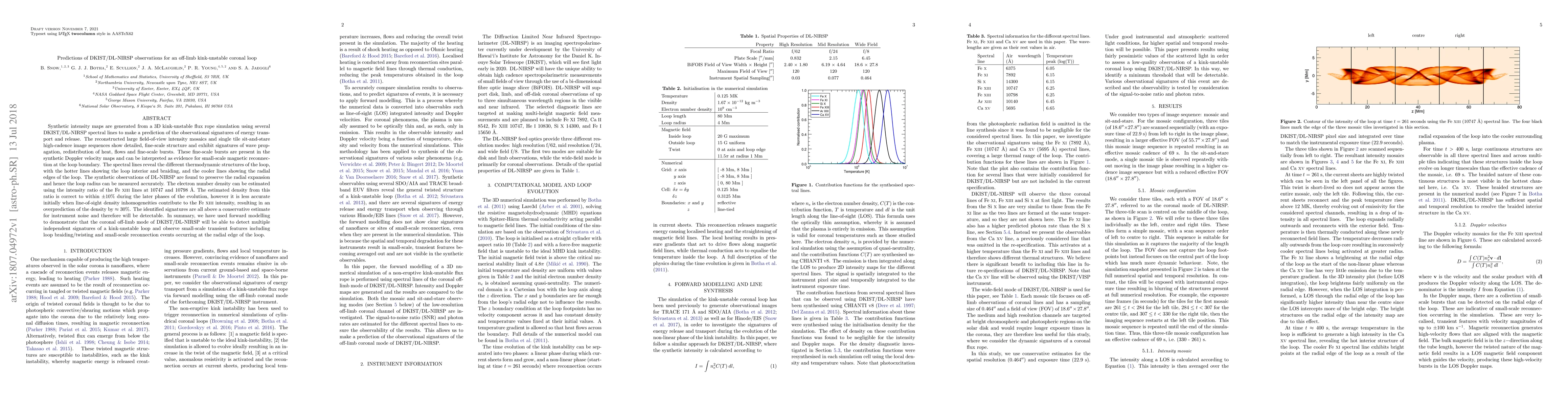 Synthetic intensity maps are generated from a 3D kink-unstable flux rope simulation using several DKIST/DL-NIRSP spectral lines to make a prediction of the observational signatures of energy transport and release. The reconstructed large field-of-view intensity mosaics and single tile sit-and-stare high-cadence image sequences show detailed, fine-scale structure and exhibit signatures of wave propagation, redistribution of heat, flows and fine-scale bursts. These fine-scale bursts are present in the synthetic Doppler velocity maps and can be interpreted as evidence for small-scale magnetic reconnection at the loop boundary. The spectral lines reveal the different thermodynamic structures of the loop, with the hotter lines showing the loop interior and braiding, and the cooler lines showing the radial edges of the loop. The synthetic observations of DL-NIRSP are found to preserve the radial expansion and hence the loop radius can be measured accurately. The electron number density can be estimated using the intensity ratio of the Fe~\textsc{xiii} lines at 10747 and 10798~\AA. The estimated density from this ratio is correct to within $\pm10\%$ during the later phases of the evolution, however it is less accurate initially when line-of-sight density inhomogeneities contribute to the Fe~\textsc{xiii} intensity, resulting in an overprediction of the density by $\approx30\%$. The identified signatures are all above a conservative estimate for instrument noise and therefore will be detectable. In summary, we have used forward modelling to demonstrate that the coronal off-limb mode of DKIST/DL-NIRSP will be able to detect multiple independent signatures of a kink-unstable loop and observe small-scale transient features including loop braiding/twisting and small-scale reconnection events occurring at the radial edge of the loop.
