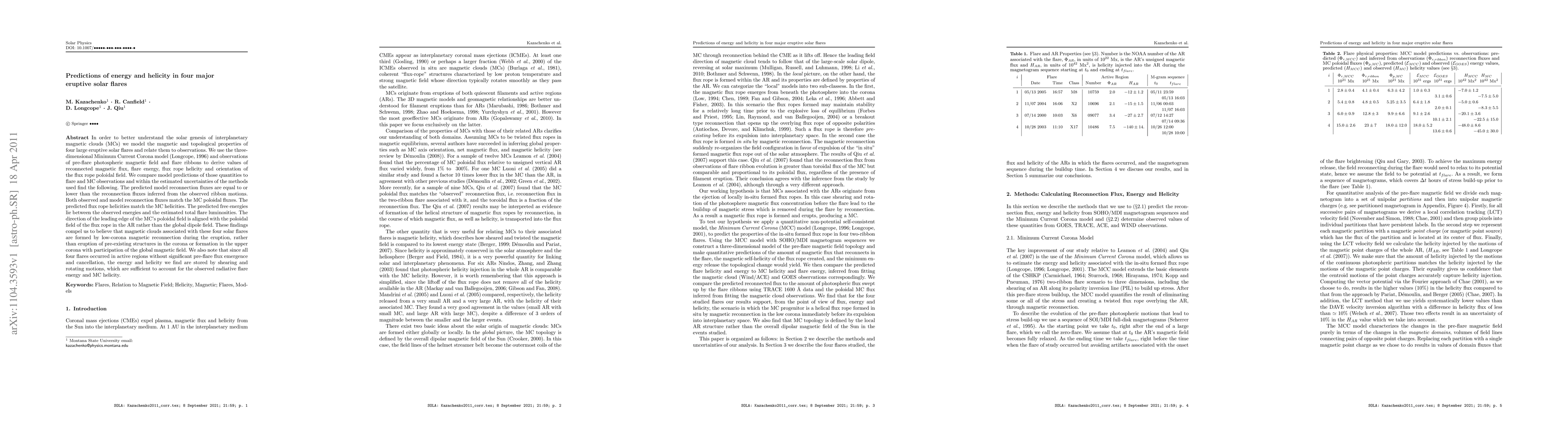 This study models four large solar flares to understand their energy and magnetic properties, finding that reconnection fluxes match observations and helicities align with those of interplanetary magnetic clouds, suggesting a low-corona reconnection origin.