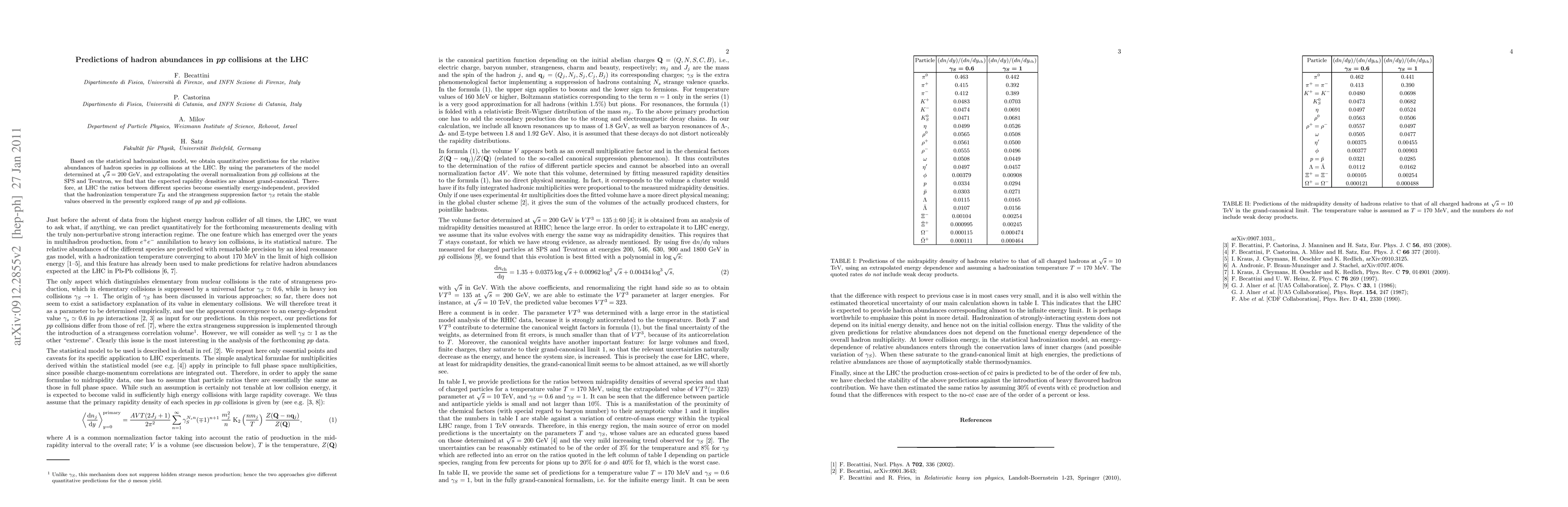 The paper uses the statistical hadronization model to predict hadron abundances in pp collisions at the LHC. It finds that the ratios between different hadron species become energy-independent at LHC energies, given stable values for hadronization temperature and strangeness suppression factor.