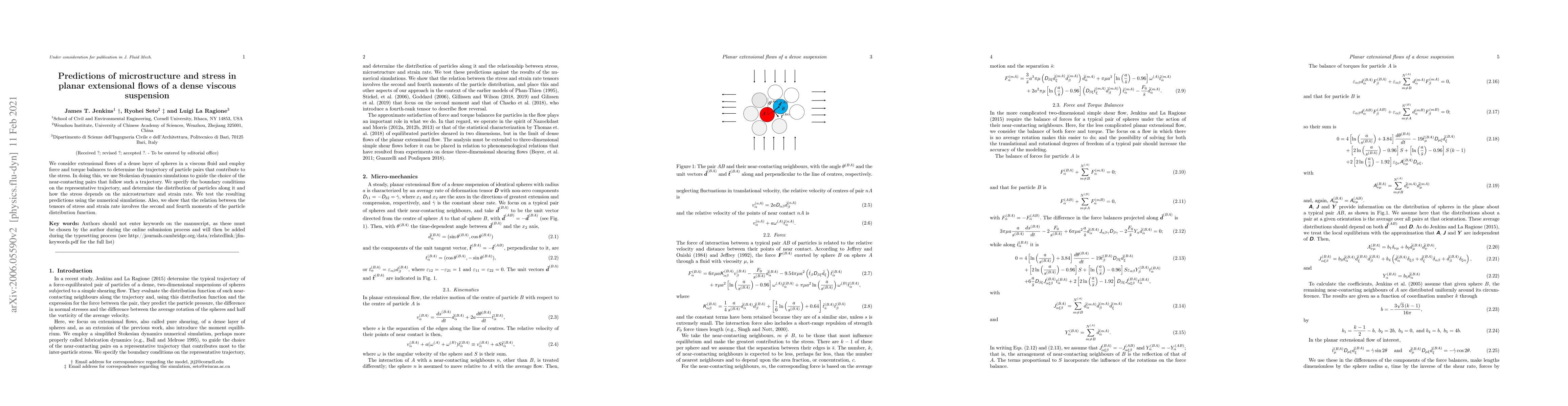 This paper investigates the microstructure and stress in dense viscous suspensions under planar extensional flow using force and torque balances, guided by Stokesian dynamics simulations. The study determines the stress distribution and its dependence on particle microstructure and strain rate, validated through numerical simulations, and reveals the relationship between stress and strain rate tensors involving particle distribution moments.