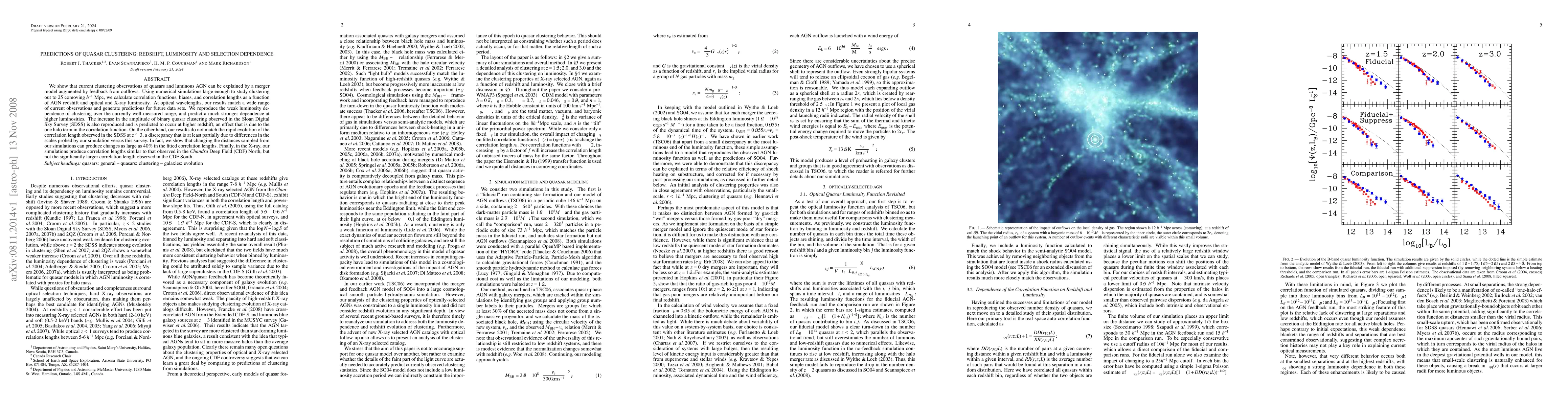 This paper uses numerical simulations to explain quasar clustering through a merger model with feedback from outflows, matching observations at optical wavelengths and predicting stronger luminosity dependence at higher luminosities. The study also notes discrepancies in the evolution of correlation length at high redshifts and in X-ray observations between different surveys.