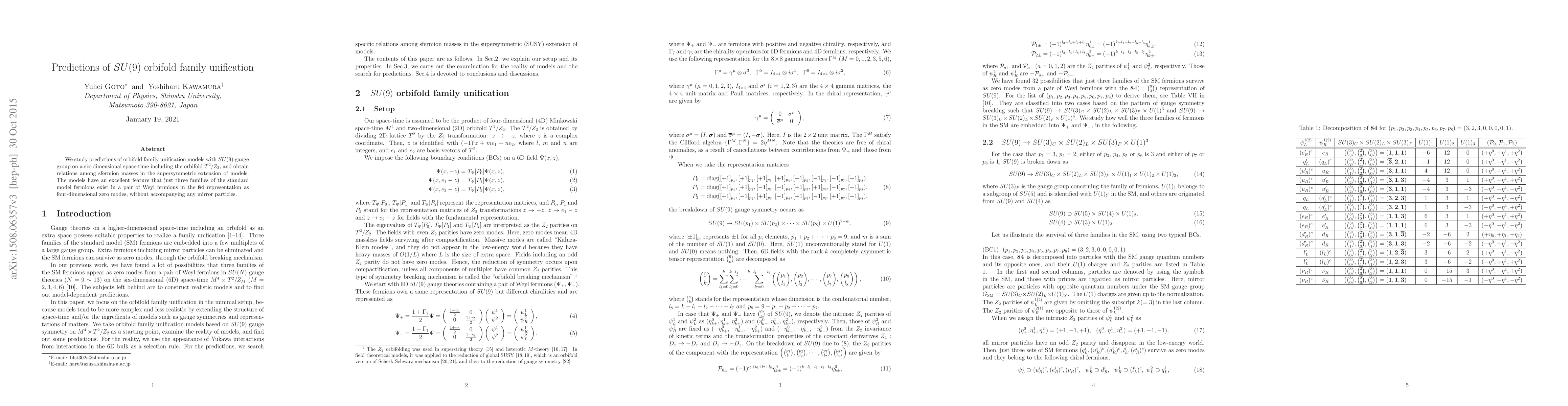 Orbifold family unification models based on SU(9) gaugesymmetry were used as a starting point.