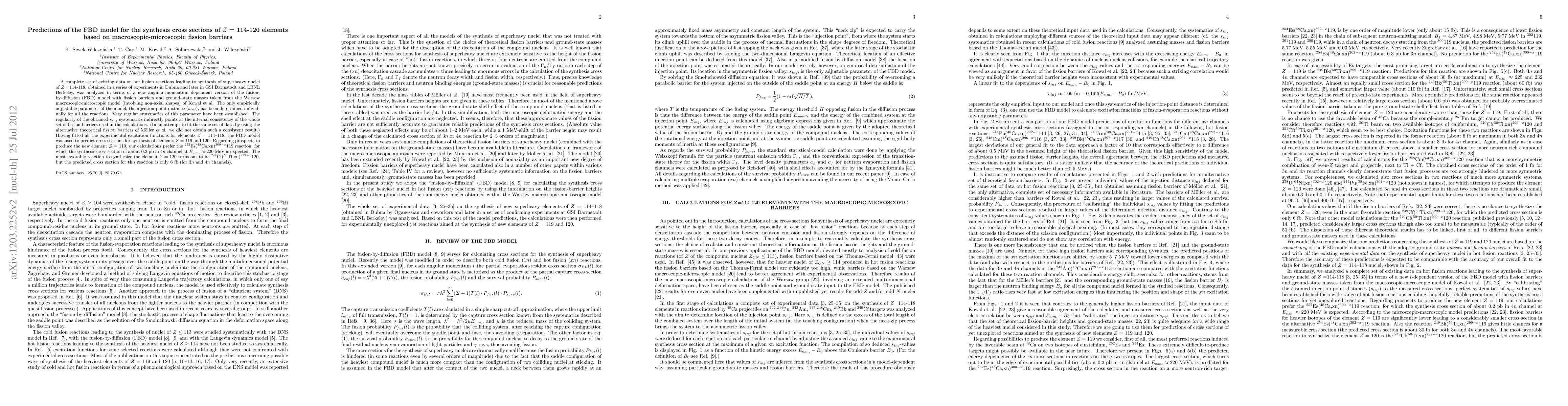 A complete set of existing data on hot fusion reactions leading to synthesis of superheavy nuclei of Z =114-118, obtained in a series of experiments in Dubna and later in GSI Darmstadt and LBNL Berkeley, was analyzed in terms of a new angular-momentum dependent version of the Fusion by Diffusion (FBD) model with fission barriers and ground-state masses taken from the Warsaw macroscopic-microscopic model (involving non-axial shapes) of Kowal et al. The only empirically adjustable parameter of the model, the injection-point distance (sinj), has been determined individually for all the reactions and very regular systematics of this parameter have been established. The regularity of the obtained sinj systematics indirectly points at the internal consistency of the whole set of fission barriers used in the calculations. Having fitted all the experimental excitation functions for elements Z = 114-118, the FBD model (with the new sinj systematics) was used to predict cross sections for synthesis of elements Z = 119 and 120. Regarding prospects to produce the new element Z = 119, our calculations prefer the 252Es(48Ca,xn)300-x119 reaction, for which the synthesis cross section of about 0.2 pb in 4n channel at Ec.m.= 220 MeV is expected. The most favorable reaction to synthesize the element Z = 120 turns out to be 249Cf(50Ti,xn)299-x120, but the predicted cross section for this reaction is only 6 fb (for 3n and 4n channels).