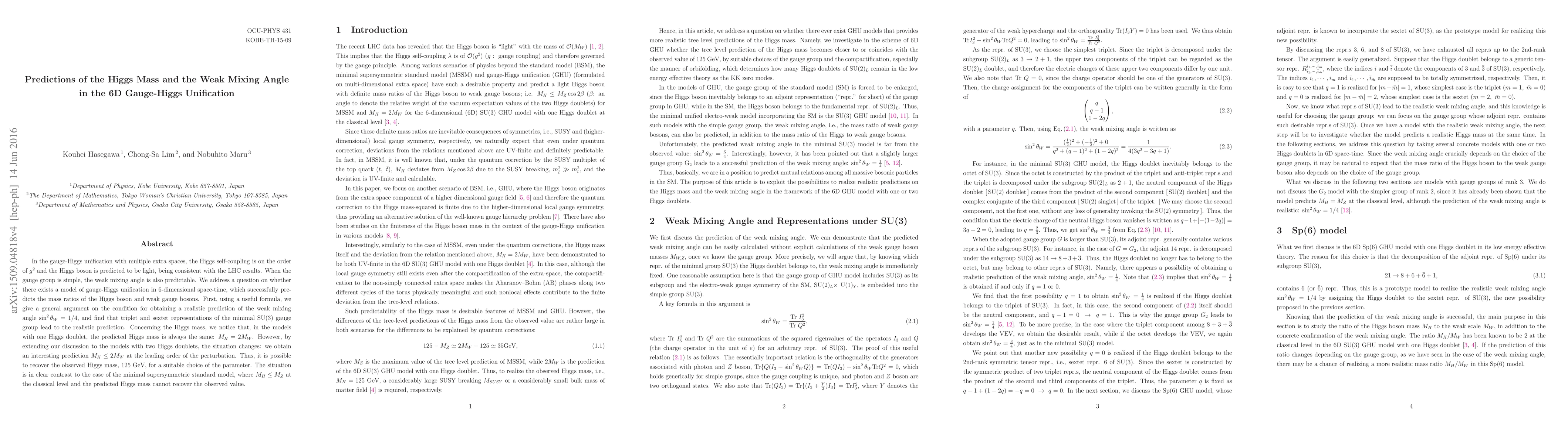 This paper explores a 6D gauge-Higgs unification model that predicts the Higgs mass and weak mixing angle in agreement with experimental results. It finds that triplet and sextet representations of the SU(3) gauge group can predict a realistic weak mixing angle, while models with two Higgs doublets allow for a predicted Higgs mass of $M_{H} \leq 2M_{W}$, enabling the observed Higgs mass of 125 GeV with suitable parameter adjustments.