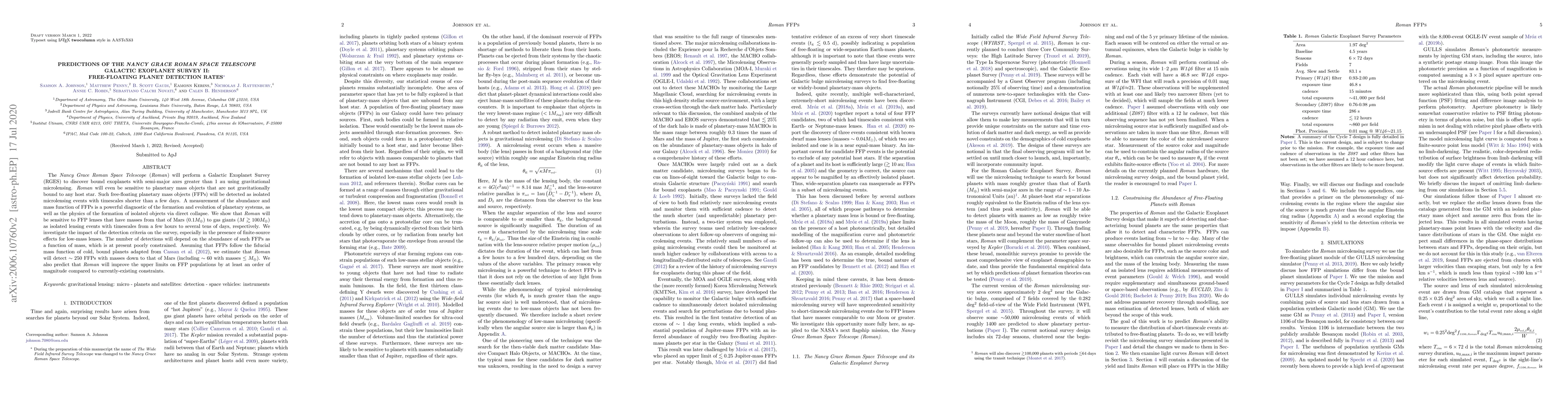 The Nancy Grace Roman Space Telescope will detect free-floating planetary mass objects (FFPs) through gravitational microlensing, identifying objects ranging from Mars to gas giants. Roman is expected to detect around 250 FFPs, significantly improving current upper limits on their populations.