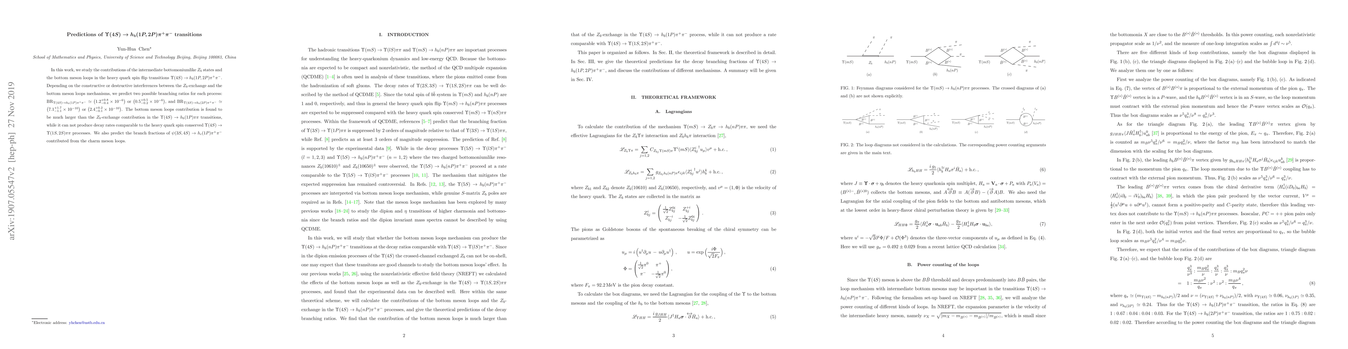 Researchers predict two possible branching ratios for $ar{b} o h_b imes ext{π} ext{π}$ transitions in heavy quark spin flip decays with varying contributions from $Z_b$ states and bottom meson loops.