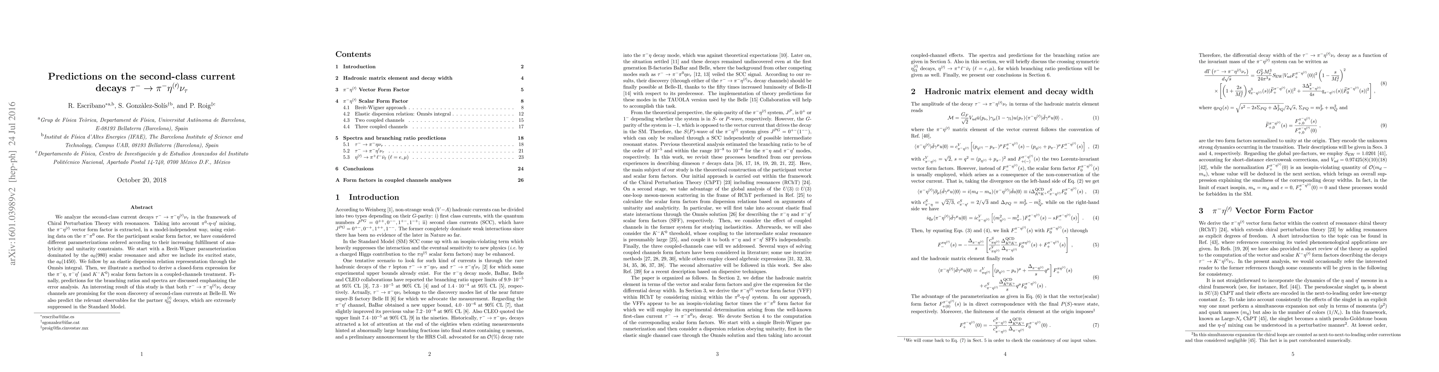This paper analyzes the second-class current decays $\tau^{-}\to\pi^{-}\eta^{(\prime)}\nu_{\tau}$ using Chiral Perturbation Theory with resonances, predicting branching ratios and spectra while emphasizing error analysis. It suggests that these decay channels are promising for discovering second-class currents at Belle-II.