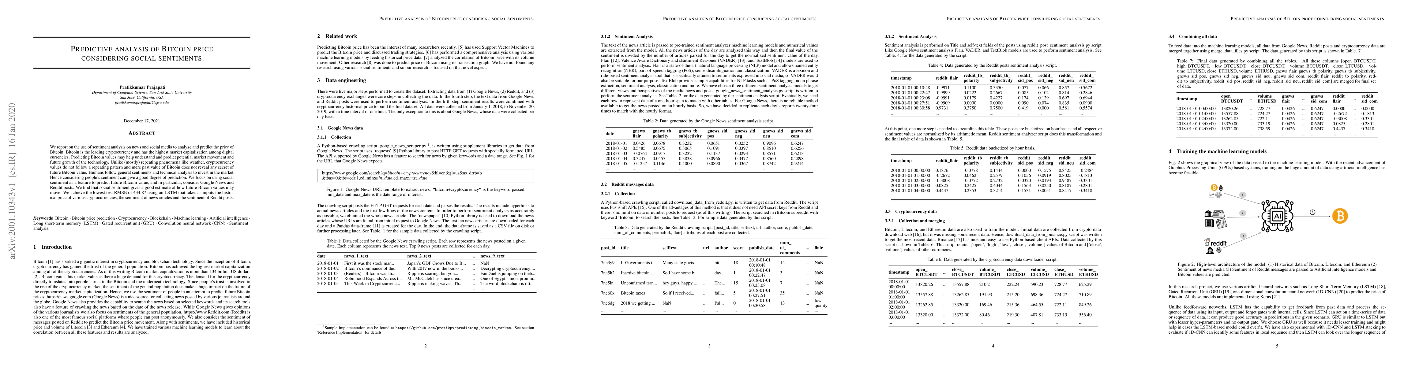 We report on the use of sentiment analysis on news and social media to analyze and predict the price of Bitcoin. Bitcoin is the leading cryptocurrency and has the highest market capitalization among digital currencies. Predicting Bitcoin values may help understand and predict potential market movement and future growth of the technology. Unlike (mostly) repeating phenomena like weather, cryptocurrency values do not follow a repeating pattern and mere past value of Bitcoin does not reveal any secret of future Bitcoin value. Humans follow general sentiments and technical analysis to invest in the market. Hence considering people's sentiment can give a good degree of prediction. We focus on using social sentiment as a feature to predict future Bitcoin value, and in particular, consider Google News and Reddit posts. We find that social sentiment gives a good estimate of how future Bitcoin values may move. We achieve the lowest test RMSE of 434.87 using an LSTM that takes as inputs the historical price of various cryptocurrencies, the sentiment of news articles and the sentiment of Reddit posts.