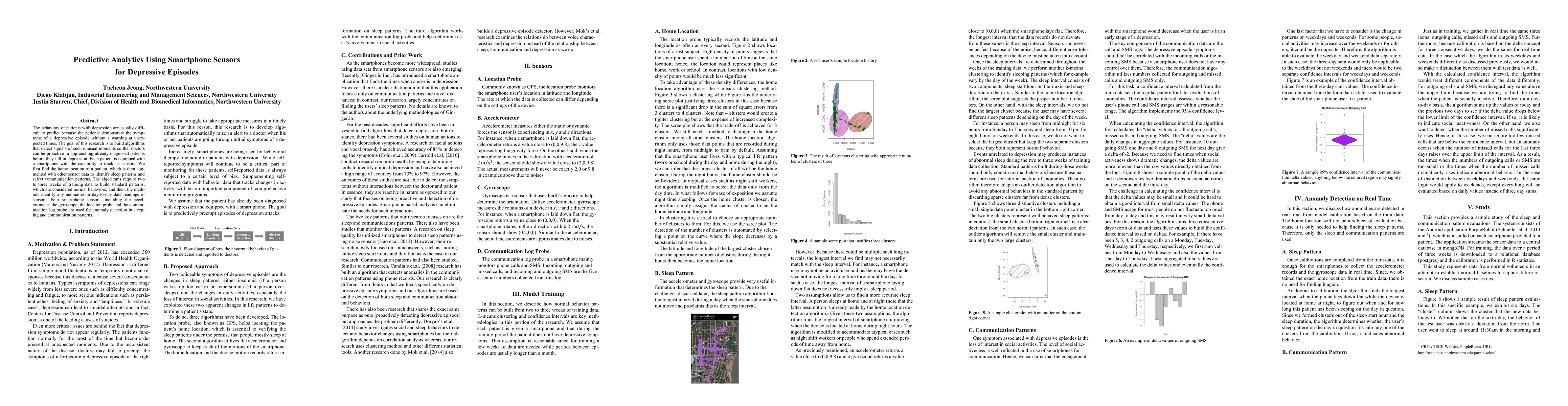 This research develops algorithms using smartphone sensors to predict depressive episodes by detecting anomalies in sleep and communication patterns. It requires two to three weeks of training data to establish normal behaviors, after which it identifies deviations using sensors like the accelerometer and gyroscope.