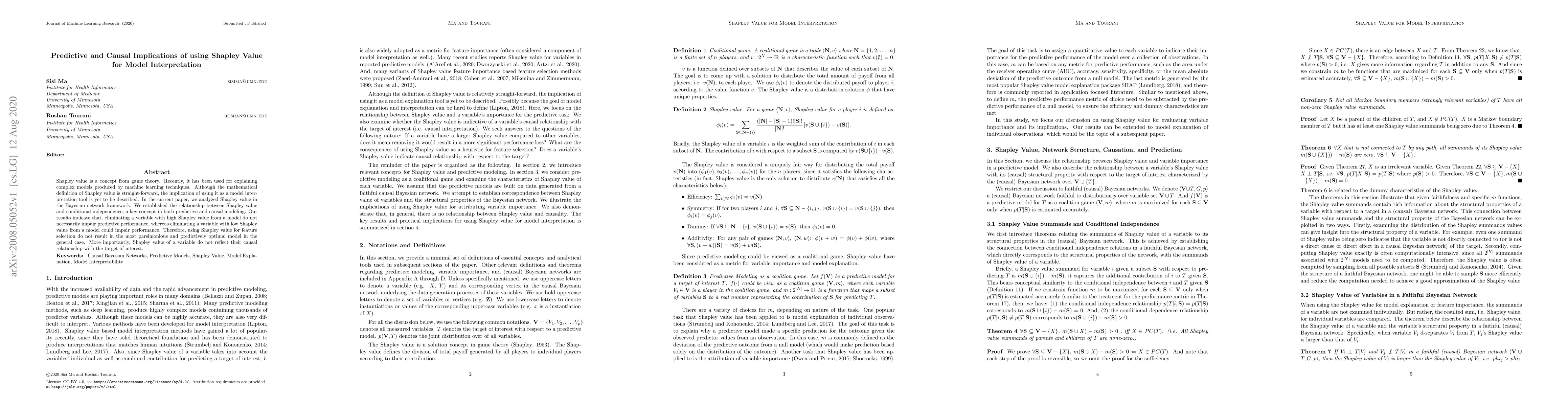 This paper explores the use of Shapley value for interpreting machine learning models, particularly within Bayesian networks. It finds that while Shapley value can indicate predictive importance, it does not necessarily reflect causal relationships, and thus, cannot guarantee optimal feature selection for predictive performance.