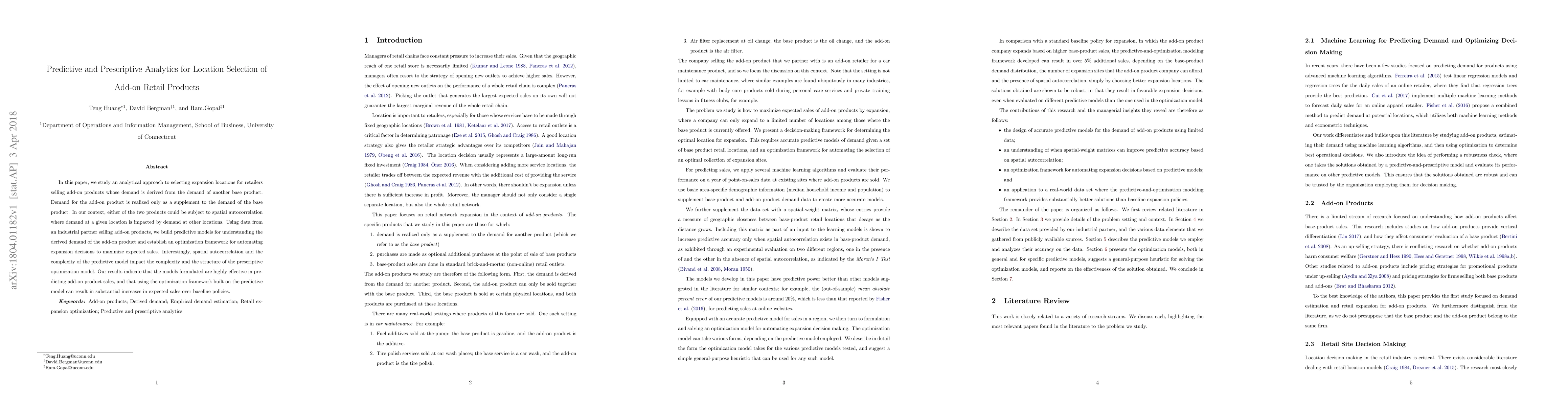 In this paper, we study an analytical approach to selecting expansion locations for retailers selling add-on products whose demand is derived from the demand of another base product. Demand for the add-on product is realized only as a supplement to the demand of the base product. In our context, either of the two products could be subject to spatial autocorrelation where demand at a given location is impacted by demand at other locations. Using data from an industrial partner selling add-on products, we build predictive models for understanding the derived demand of the add-on product and establish an optimization framework for automating expansion decisions to maximize expected sales. Interestingly, spatial autocorrelation and the complexity of the predictive model impact the complexity and the structure of the prescriptive optimization model. Our results indicate that the models formulated are highly effective in predicting add-on product sales, and that using the optimization framework built on the predictive model can result in substantial increases in expected sales over baseline policies.