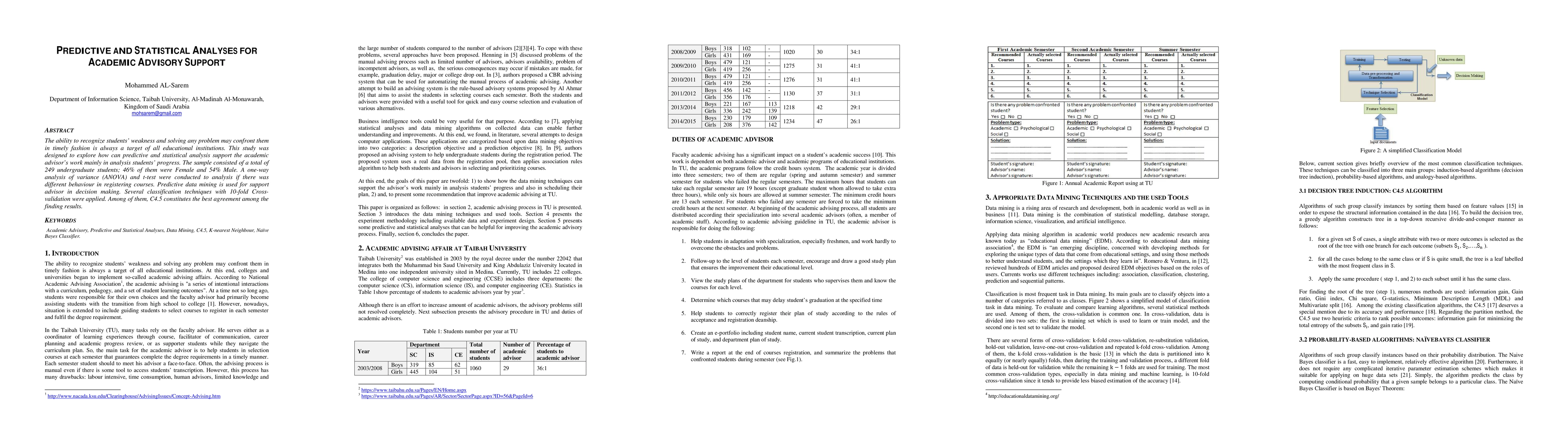 The ability to recognize weakness of students and solving any problem may confront them in timely fashion is always a target of all educational institutions. This study was designed to explore how can predictive and statistical analysis support the academic work of adviser mainly in analysis progress of students . The sample consisted of a total of 249 undergraduate students: 46 % of them were Female and 54% Male. A one-way analysis of variance and t-test were conducted to analysis if there was different behavior in registering courses. Predictive data mining is used for support adviser in decision making. Several classification techniques with 10-fold Cross validation were applied. Among of them, C 4.5 constitutes the best agreement among the finding results.