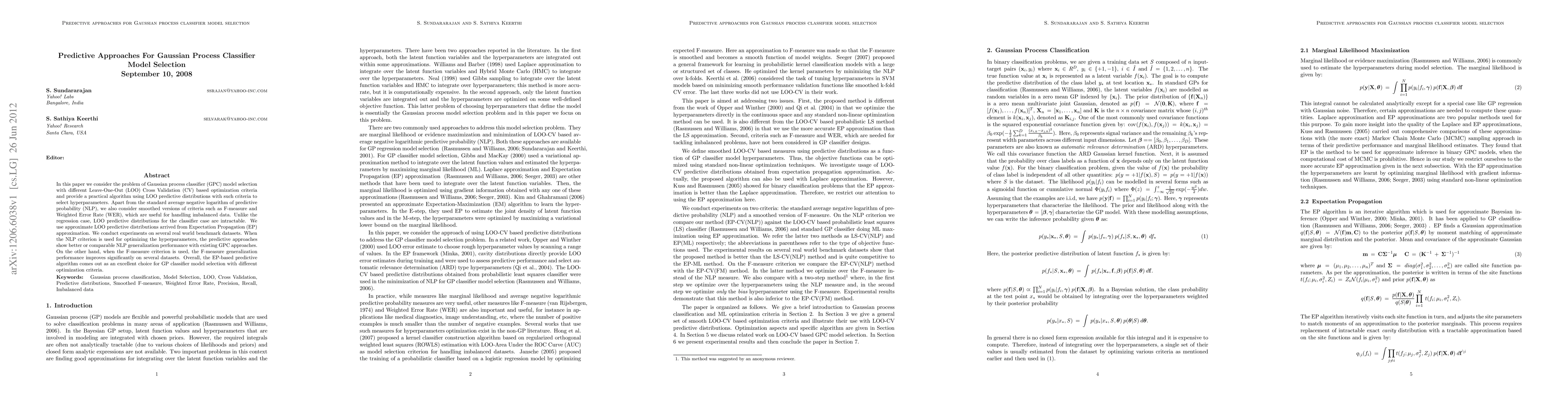 This paper proposes a practical algorithm for Gaussian process classifier (GPC) model selection using Leave-One-Out Cross Validation criteria, including smoothed versions of the F-measure and Weighted Error Rate for imbalanced data. The authors utilize Expectation Propagation to approximate intractable predictive distributions, demonstrating improved performance on benchmark datasets.