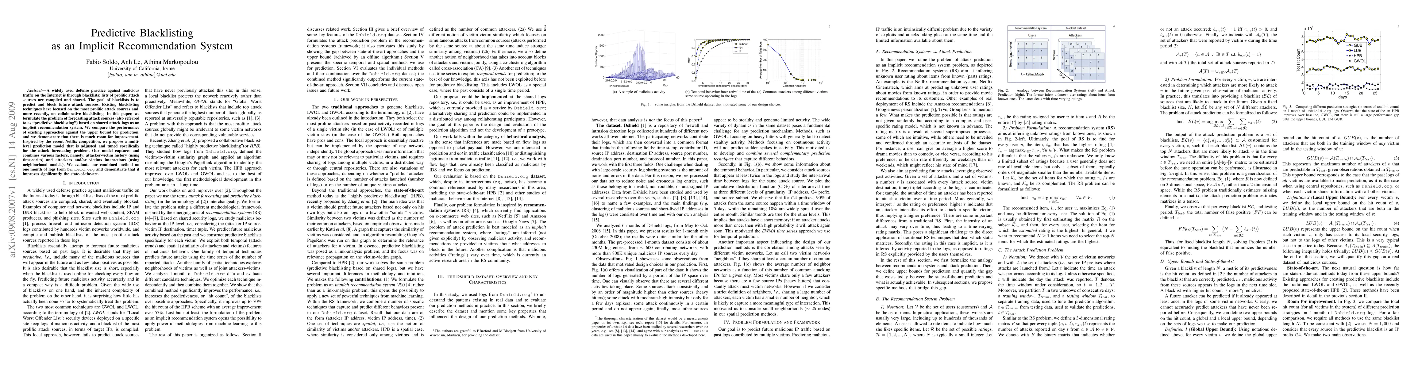 This paper proposes a predictive blacklisting method framed as an implicit recommendation system to forecast future attack sources by analyzing shared attack logs. The authors introduce a multi-level prediction model that combines time-series and neighborhood models to enhance forecasting accuracy, showing significant improvements over existing methods using Dshield.org data.