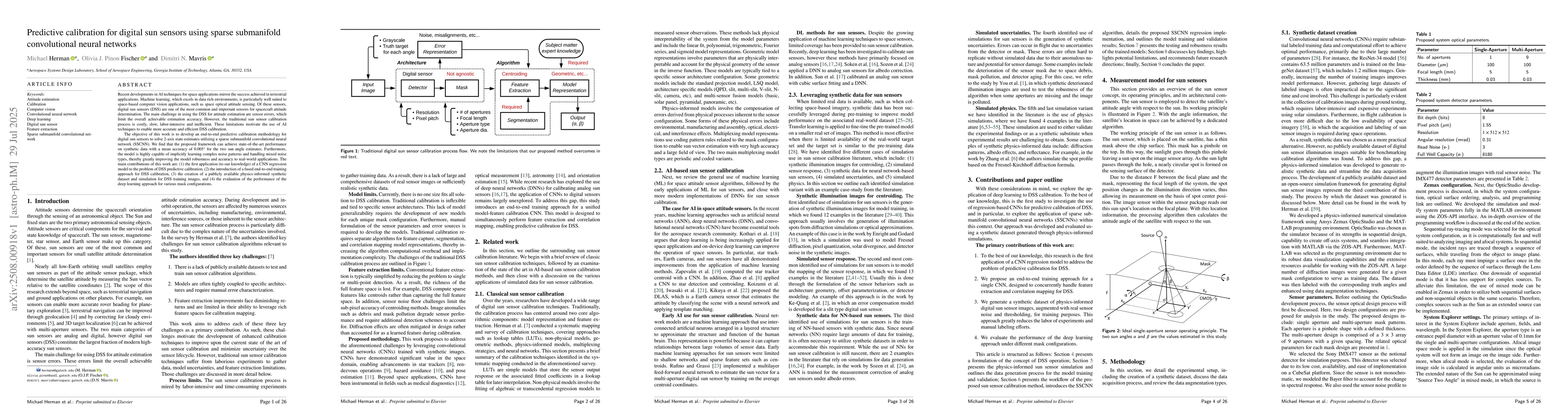 Recent developments in AI techniques for space applications mirror the success achieved in terrestrial applications. Machine learning, which excels in data rich environments, is particularly well suited to space-based computer vision applications, such as space optical attitude sensing. Of these sensors, digital sun sensors (DSS) are one of the most common and important sensors for spacecraft attitude determination. The main challenge in using the DSS for attitude estimation are sensor errors, which limit the overall achievable estimation accuracy. However, the traditional sun sensor calibration process is costly, slow, labor-intensive and inefficient. These limitations motivate the use of AI techniques to enable more accurate and efficient DSS calibration. The objective of this work is to develop an end-to-end predictive calibration methodology for digital sun sensors to solve 2-axis state estimates utilizing a sparse submanifold convolutional neural network (SSCNN). We find that the proposed framework can achieve state-of-the-art performance on synthetic data with a mean accuracy of 0.005{\deg} for the two sun angle estimates. Furthermore, the model is highly capable of implicitly learning complex noise patterns and handling mixed noise types, thereby greatly improving the model robustness and accuracy to real-world applications. The main contributions of this work are: (1) the first application (to our knowledge) of a CNN regression model to the problem of DSS predictive calibration, (2) the introduction of a fused end-to-end training approach for DSS calibration, (3) the creation of a publicly available physics-informed synthetic dataset and simulation for DSS training images, and (4) the evaluation of the performance of the deep learning approach for various mask configurations.
