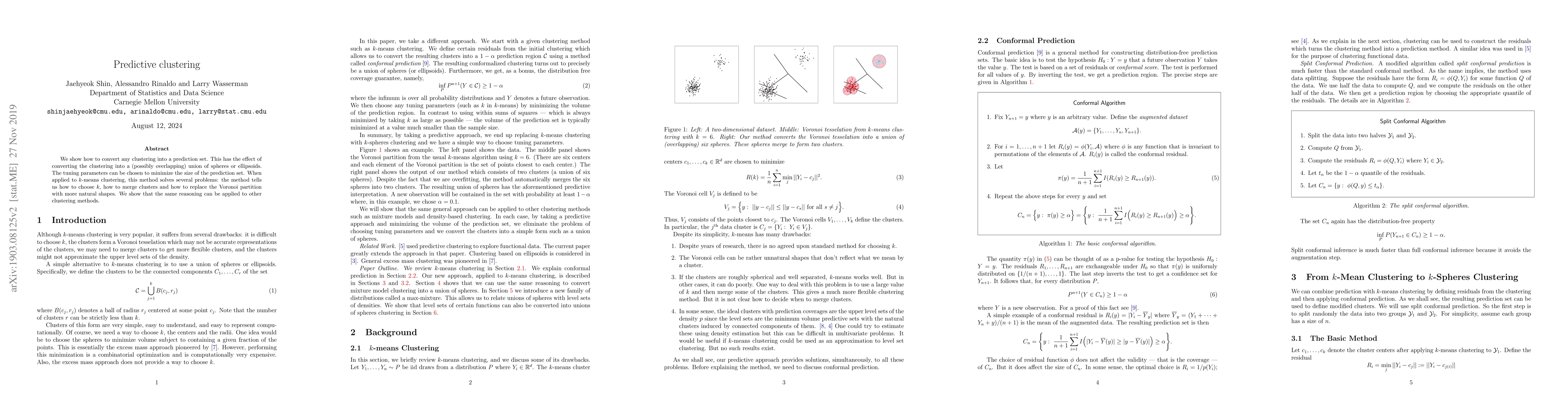 We show how to convert any clustering into a prediction set. This has the effect of converting the clustering into a (possibly overlapping) union of spheres or ellipsoids. The tuning parameters can be chosen to minimize the size of the prediction set. When applied to k-means clustering, this method solves several problems: the method tells us how to choose k, how to merge clusters and how to replace the Voronoi partition with more natural shapes. We show that the same reasoning can be applied to other clustering methods.