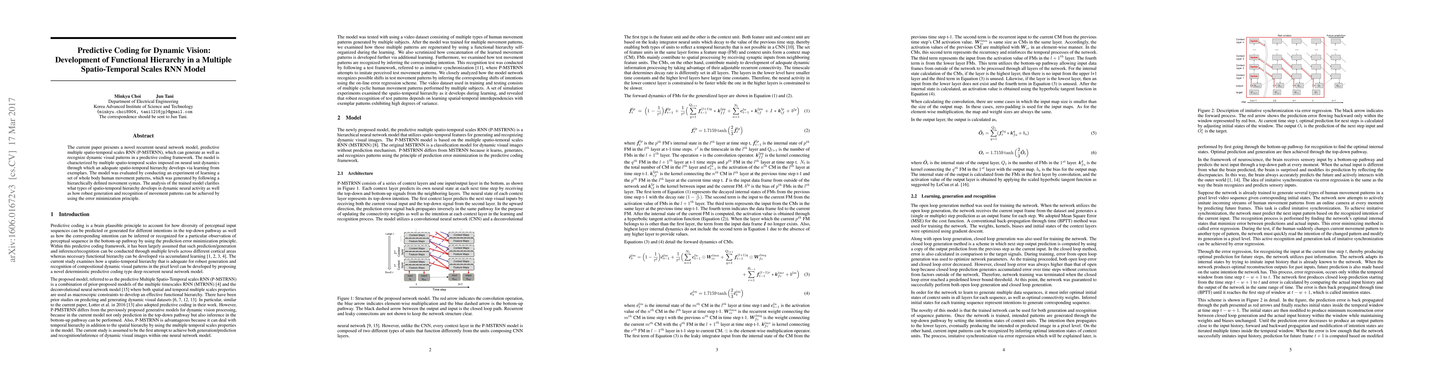 This paper introduces a predictive multiple spatio-temporal scales RNN (P-MSTRNN) model that generates and recognizes dynamic visual patterns through a functional hierarchy developed via learning from exemplars. The model's ability to robustly learn and recognize human movement patterns demonstrates its effectiveness in dynamic vision.