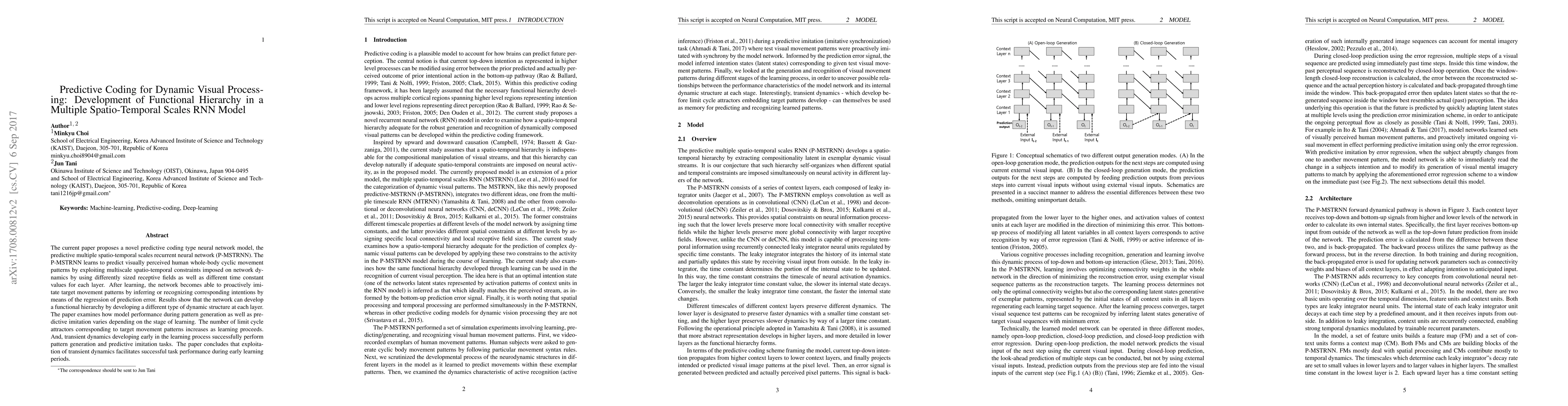 This paper introduces a predictive coding neural network model, the P-MSTRNN, which uses multiscale spatio-temporal constraints to predict human whole-body cyclic movements. The model develops a functional hierarchy and improves in pattern generation and predictive imitation as learning progresses, highlighting the role of transient dynamics in early learning success.