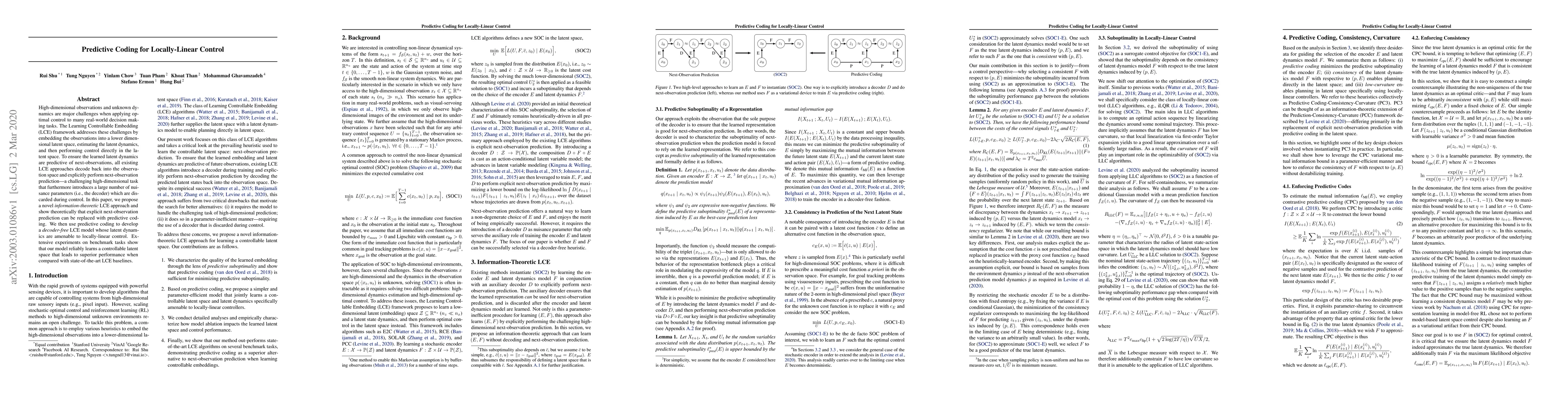 This paper proposes a novel information-theoretic Learning Controllable Embedding (LCE) framework using predictive coding to replace explicit next-observation prediction, eliminating the decoder and enabling locally-linear control in the latent space, which outperforms existing LCE methods.