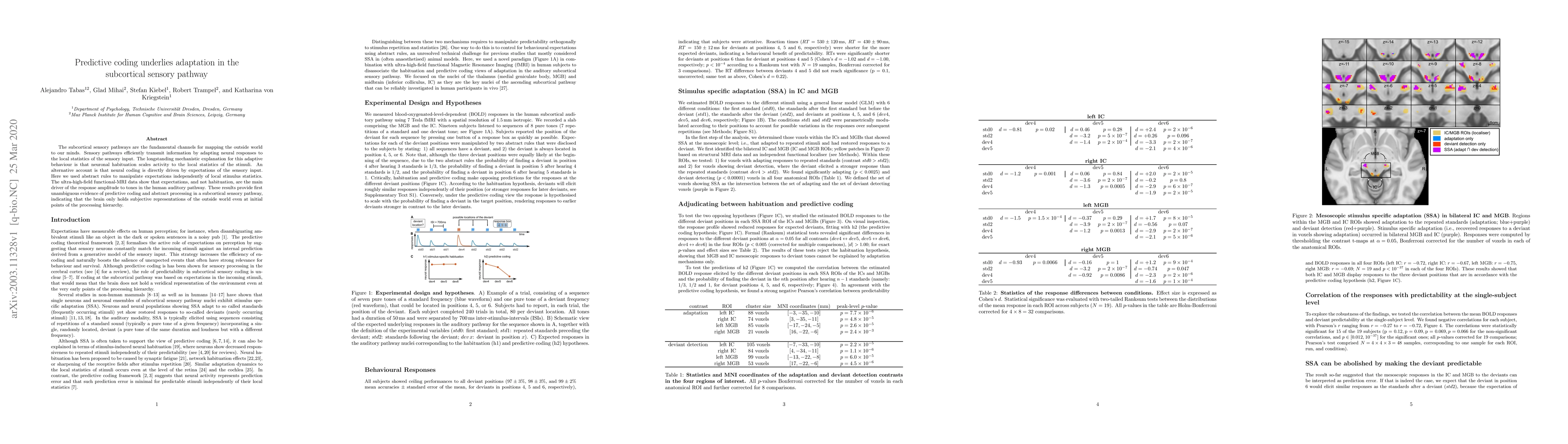 Abstract: This study demonstrates that predictive coding, rather than neuronal habituation, underlies adaptation in the subcortical sensory pathway. Using ultra-high-field functional-MRI, researchers found that expectations drive response amplitude to tones in the human auditory pathway, providing evidence for predictive coding and abstract processing in initial sensory processing stages.