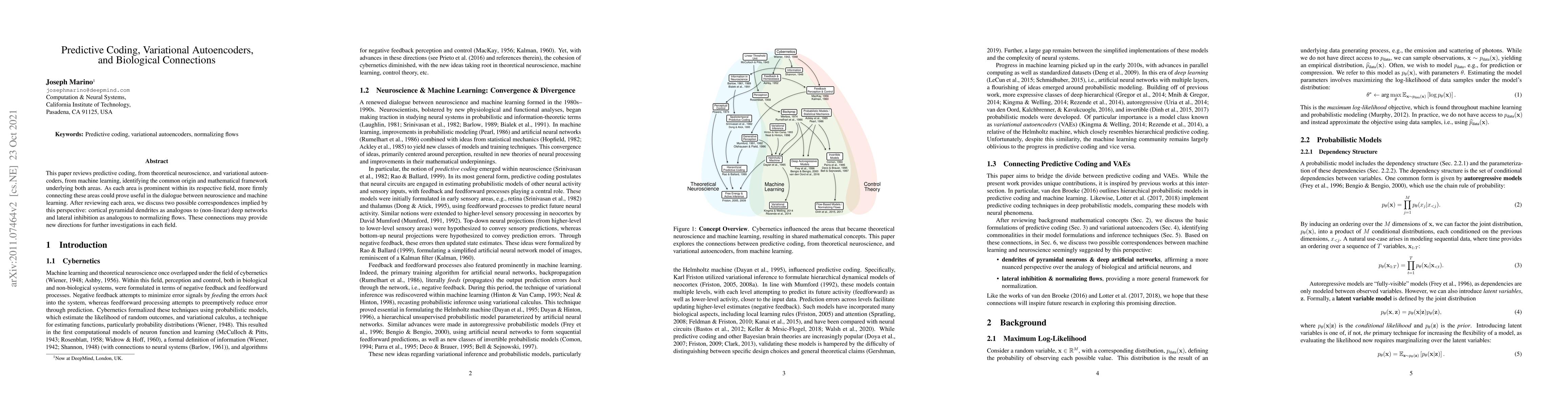 This paper reviews predictive coding, from theoretical neuroscience, and variational autoencoders, from machine learning, identifying the common origin and mathematical framework underlying both areas. As each area is prominent within its respective field, more firmly connecting these areas could prove useful in the dialogue between neuroscience and machine learning. After reviewing each area, we discuss two possible correspondences implied by this perspective: cortical pyramidal dendrites as analogous to (non-linear) deep networks and lateral inhibition as analogous to normalizing flows. These connections may provide new directions for further investigations in each field.