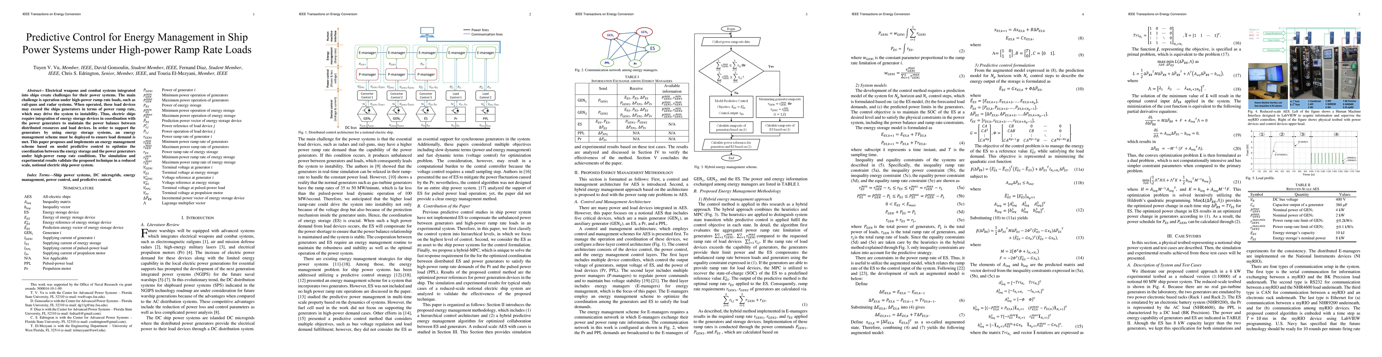 Electrical weapons and combat systems integrated into ships create challenges for their power systems. The main challenge is operation under high-power ramp rate loads, such as rail-guns and radar systems. When operated, these load devices may exceed the ships generators in terms of power ramp rate, which may drive the system to instability. Thus, electric ships require integration of energy storage devices in coordination with the power generators to maintain the power balance between distributed resources and load devices. In order to support the generators by using energy storage systems, an energy management scheme must be deployed to ensure load demand is met. This paper proposes and implements an energy management scheme based on model predictive control to optimize the coordination between the energy storage and the power generators under high-power ramp rate conditions. The simulation and experimental results validate the proposed technique in a reduced scale, notional electric ship power system.
