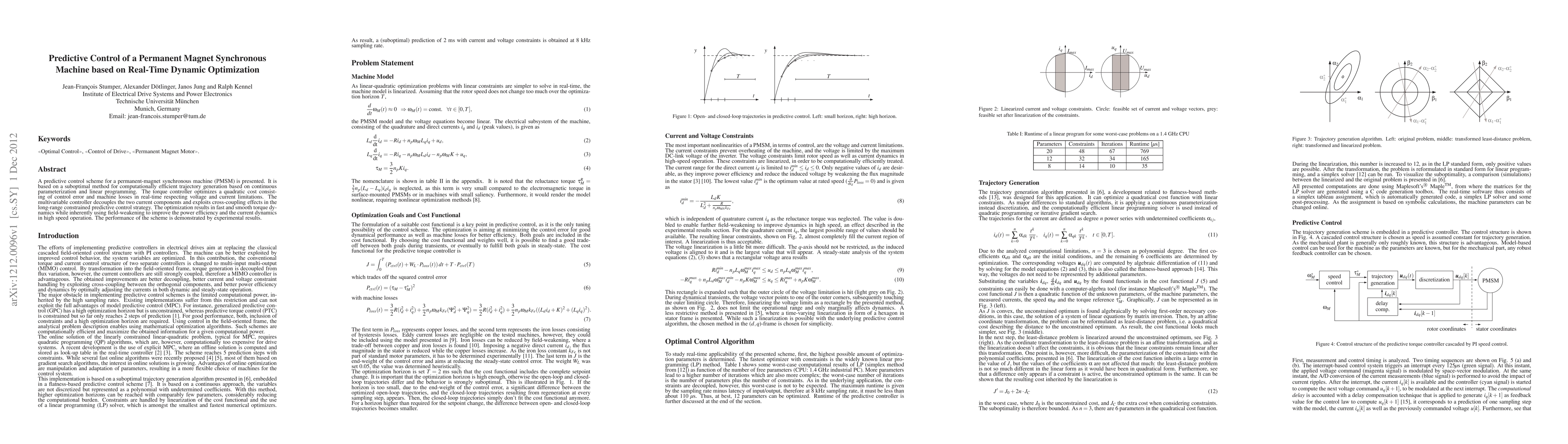A predictive control scheme for a permanent-magnet synchronous machine (PMSM) is presented. It is based on a suboptimal method for computationally efficient trajectory generation based on continuous parameterization and linear programming. The torque controller optimizes a quadratic cost consisting of control error and machine losses in real-time respecting voltage and current limitations. The multivariable controller decouples the two current components and exploits cross-coupling effects in the long-range constrained predictive control strategy. The optimization results in fast and smooth torque dynamics while inherently using field-weakening to improve the power efficiency and the current dynamics in high speed operation. The performance of the scheme is demonstrated by experimental results.