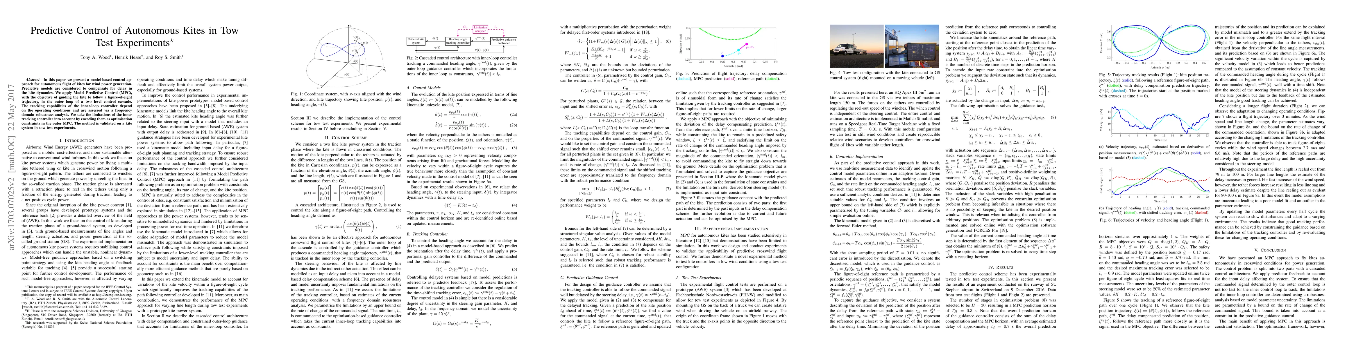 In this paper we present a model-based control approach for autonomous flight of kites for wind power generation. Predictive models are considered to compensate for delay in the kite dynamics. We apply Model Predictive Control (MPC), with the objective of guiding the kite to follow a figure-of-eight trajectory, in the outer loop of a two level control cascade. The tracking capabilities of the inner-loop controller depend on the operating conditions and are assessed via a frequency domain robustness analysis. We take the limitations of the inner tracking controller into account by encoding them as optimisation constraints in the outer MPC. The method is validated on a kite system in tow test experiments.