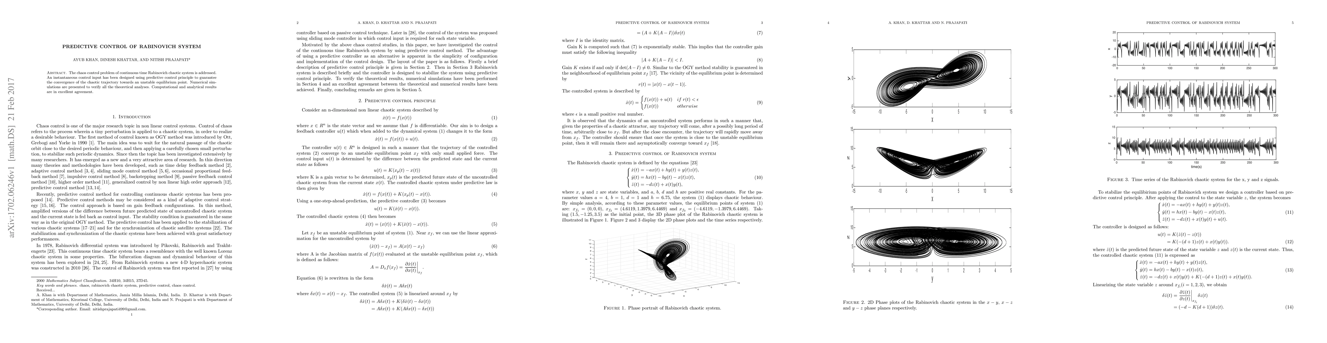 The chaos control problem of continuous time Rabinovich chaotic system is addressed. An instantaneous control input has been designed using predictive control principle to guarantee the convergence of the chaotic trajectory towards an unstable equilibrium point. Numerical simulations are presented to verify all the theoretical analyses. Computational and analytical results are in excellent agreement.