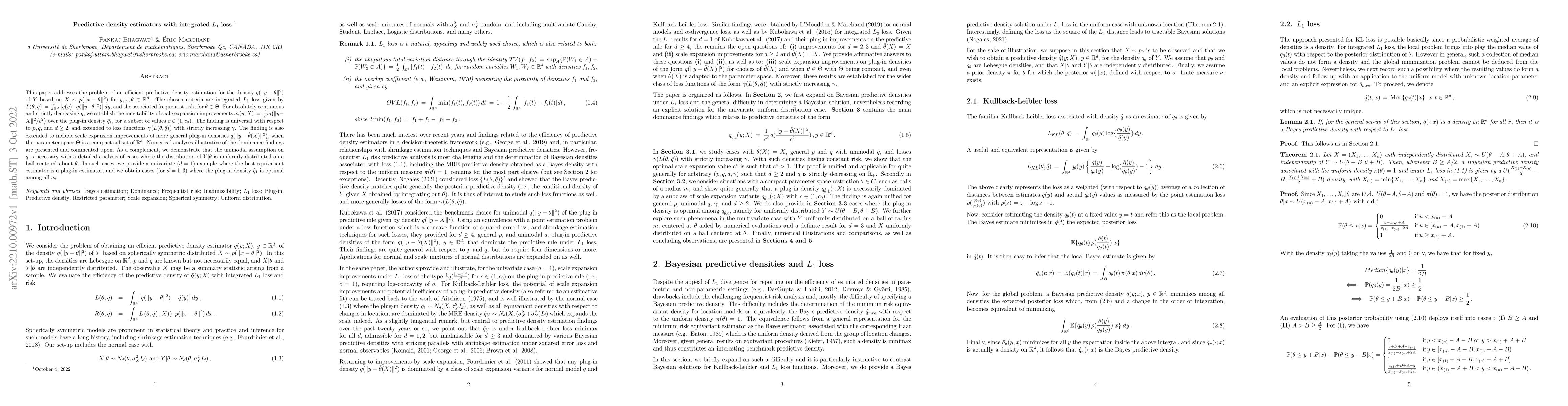 This paper develops predictive density estimators using integrated $L_1$ loss, showing that scale expansion improvements outperform plug-in densities for certain values of $c$. It also demonstrates the necessity of unimodality for the findings and provides counterexamples where plug-in estimators are optimal.