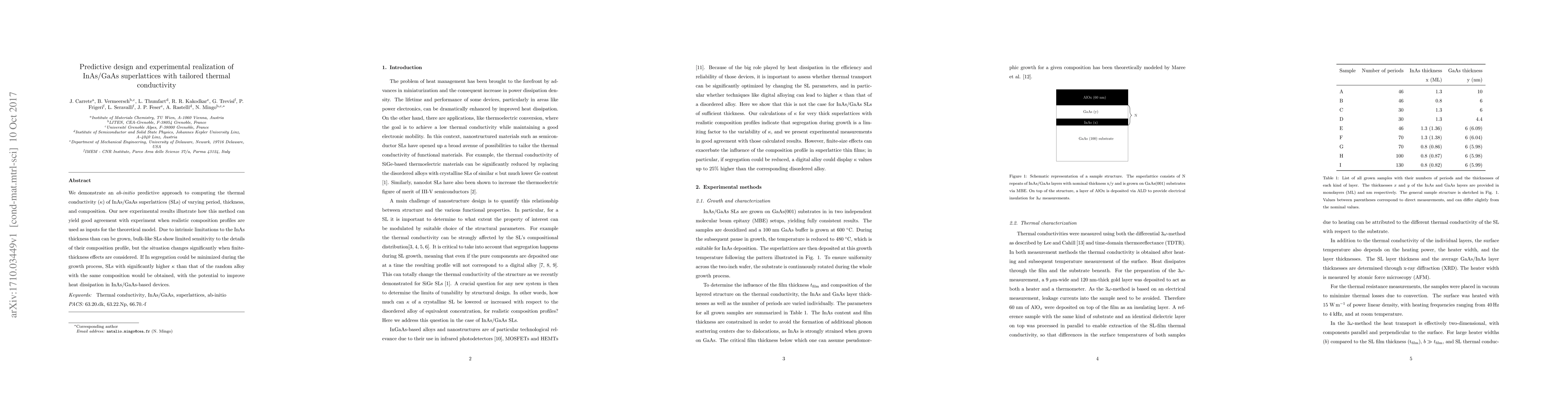 This paper presents an ab-initio method for predicting the thermal conductivity of InAs/GaAs superlattices, showing good agreement with experimental results. The study highlights that minimizing In segregation during growth could enhance thermal conductivity, potentially improving heat dissipation in related devices.