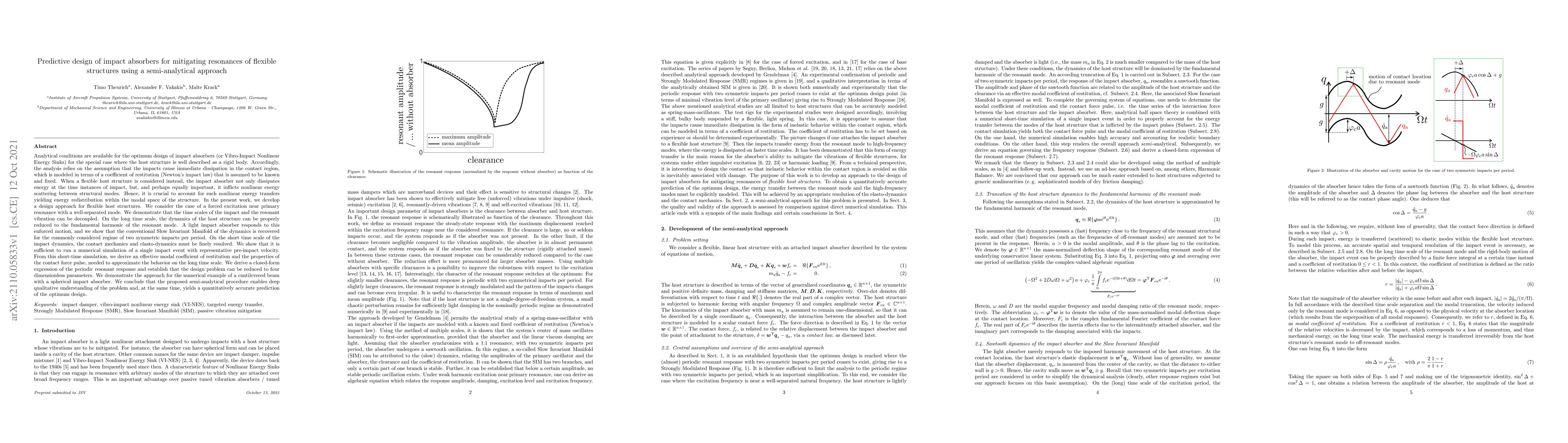 Analytical conditions are available for the optimum design of impact absorbers for the case where the host structure is well described as rigid body. Accordingly, the analysis relies on the assumption that the impacts cause immediate dissipation in the contact region, which is modeled in terms of a known coefficient of restitution. When a flexible host structure is considered instead, the impact absorber not only dissipates energy at the time instances of impact, but it inflicts nonlinear energy scattering between structural modes. Hence, it is crucial to account for such nonlinear energy transfers yielding energy redistribution within the modal space of the structure. In the present work, we develop a design approach for reonantly-driven, flexible host structures. We demonstrate decoupling of the time scales of the impact and the resonant vibration. On the long time scale, the dynamics can be properly reduced to the fundamental harmonic of the resonant mode. A light impact absorber responds to this enforced motion, and we recover the Slow Invariant Manifold of the dynamics for the regime of two impacts per period. On the short time scale, the contact mechanics and elasto-dynamics must be finely resolved. We show that it is sufficient to run a numerical simulation of a single impact event with adequate pre-impact velocity. From this simulation, we derive a modal coefficient of restitution and the properties of the contact force pulse, needed to approximate the behavior on the long time scale. We establish that the design problem can be reduced to four dimensionless parameters and demonstrate the approach for the numerical example of a cantilevered beam with an impact absorber. We conclude that the proposed semi-analytical procedure enables deep qualitative understanding of the problem and, at the same time, yields a quantitatively accurate prediction of the optimum design.