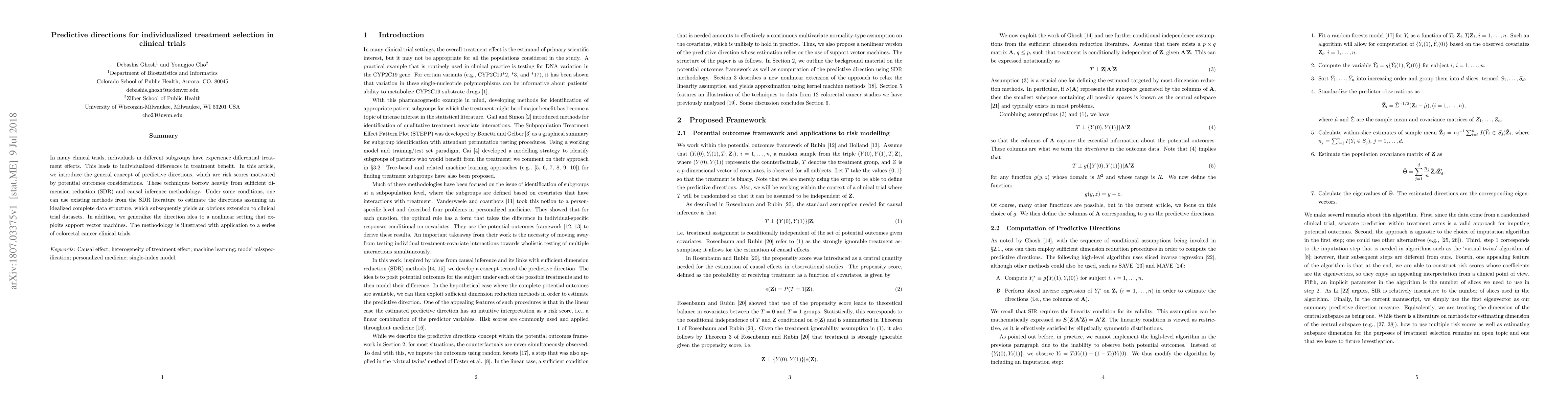This paper introduces predictive directions, risk scores based on potential outcomes, to identify individualized treatment effects in clinical trials. The methodology leverages sufficient dimension reduction and causal inference, extending to nonlinear settings using support vector machines, and is demonstrated through colorectal cancer trial data.