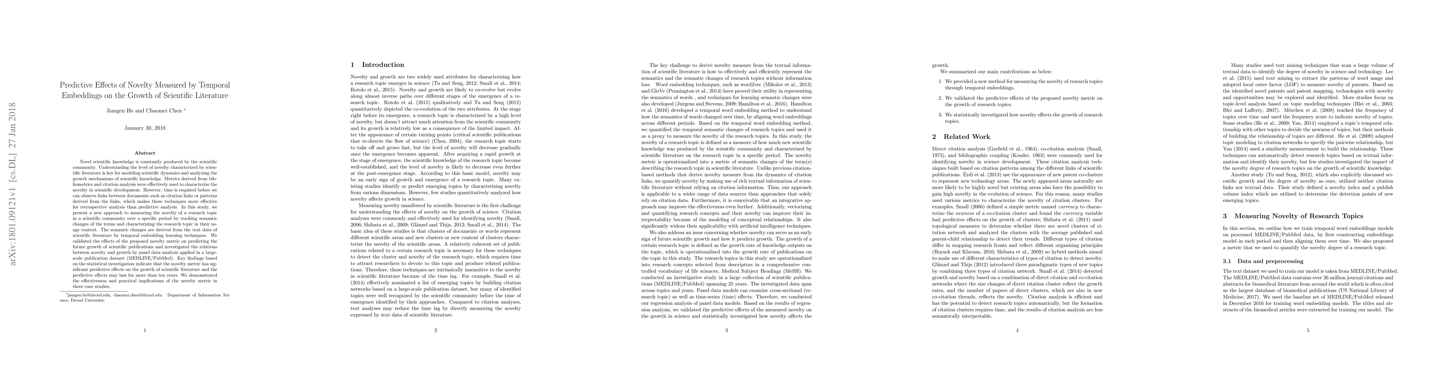 Novel scientific knowledge is constantly produced by the scientific community. Understanding the level of novelty characterized by scientific literature is key for modeling scientific dynamics and analyzing the growth mechanisms of scientific knowledge. Metrics derived from bibliometrics and citation analysis were effectively used to characterize the novelty in scientific development. However, time is required before we can observe links between documents such as citation links or patterns derived from the links, which makes these techniques more effective for retrospective analysis than predictive analysis. In this study, we present a new approach to measuring the novelty of a research topic in a scientific community over a specific period by tracking semantic changes of the terms and characterizing the research topic in their usage context. The semantic changes are derived from the text data of scientific literature by temporal embedding learning techniques. We validated the effects of the proposed novelty metric on predicting the future growth of scientific publications and investigated the relations between novelty and growth by panel data analysis applied in a large-scale publication dataset (MEDLINE/PubMed). Key findings based on the statistical investigation indicate that the novelty metric has significant predictive effects on the growth of scientific literature and the predictive effects may last for more than ten years. We demonstrated the effectiveness and practical implications of the novelty metric in three case studies.