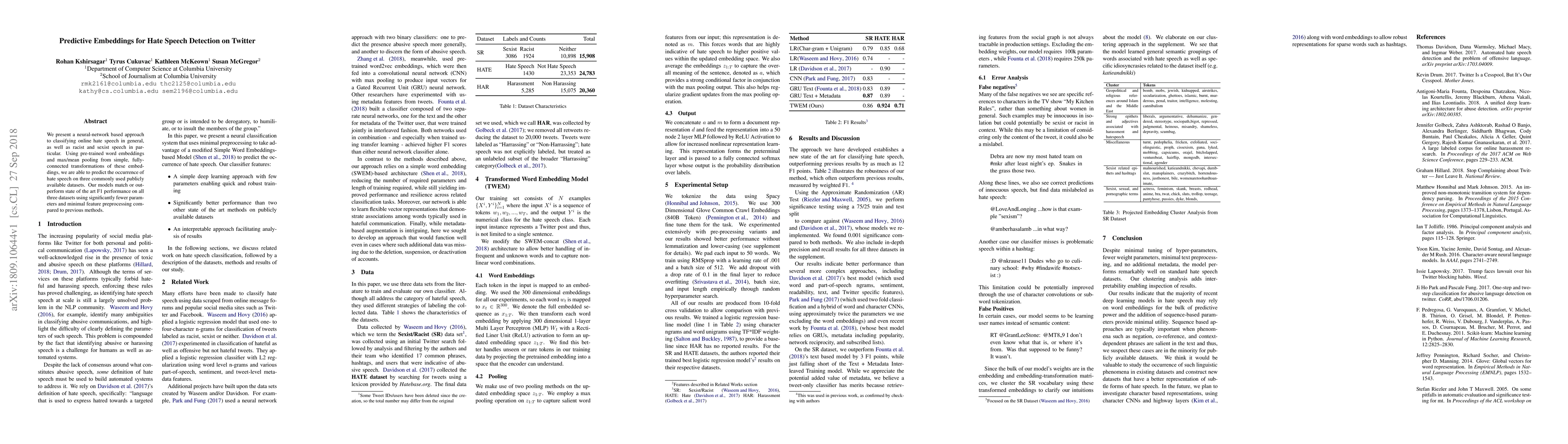 This paper introduces a neural network method for detecting hate speech, including racist and sexist language, on Twitter. The approach leverages pre-trained word embeddings and pooling techniques to achieve competitive performance with fewer parameters and minimal feature preprocessing.