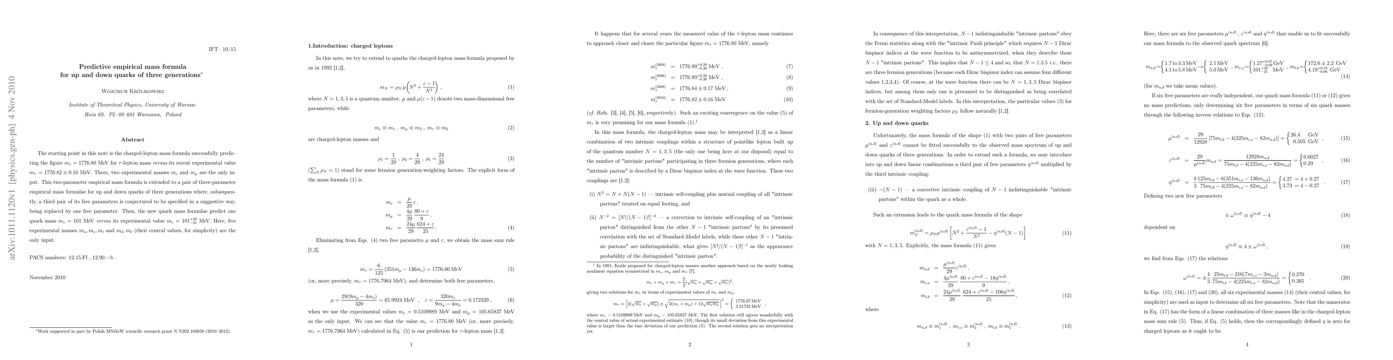 The starting point in this note is the charged-lepton mass formula successfully predicting the figure m_\tau = 1776.80 MeV for \tau-lepton mass versus its recent experimental value m_\tau = 1776.82 \pm 0.16 MeV. There, two experimental masses m_e and m_\mu are the only input. This two-parameter empirical mass formula is extended to a pair of three-parameter empirical mass formulae for up and down quarks of three generations where, subsequently, a third pair of its free parameters is conjectured to be specified in a suggestive way, being replaced by one free parameter. Then, the new quark mass formulae predict one quark mass m_s = 101 MeV versus its experimental value m_s = 101^{+29}_{-21} MeV. Here, five experimental masses m_u, m_c, m_t and m_d, m_b (their central values, for simplicity) are the only input.