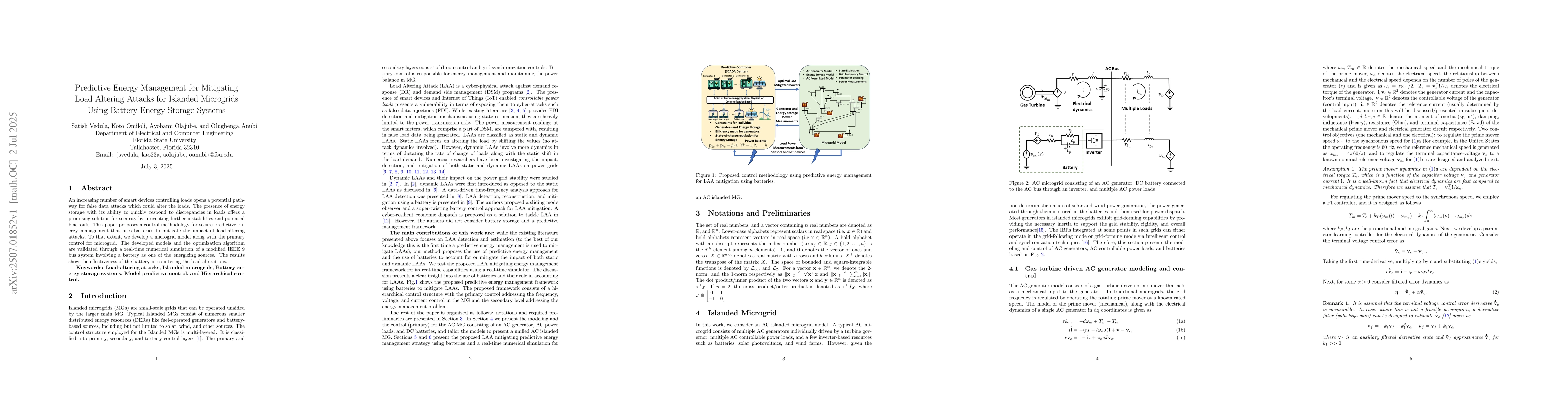 An increasing number of smart devices controlling loads opens a potential pathway for false data attacks which could alter the loads. The presence of energy storage with its ability to quickly respond to discrepancies in loads offers a promising solution for security by preventing further instabilities and potential blackouts. This paper proposes a control methodology for secure predictive energy management that uses batteries to mitigate the impact of load-altering attacks. To that extent, we develop a microgrid model along with the primary control for microgrid. The developed models and the optimization algorithm are validated through a real-time numerical simulation of a modified IEEE 9 bus system involving a battery as one of the energizing sources. The results show the effectiveness of the battery in countering the load alterations.