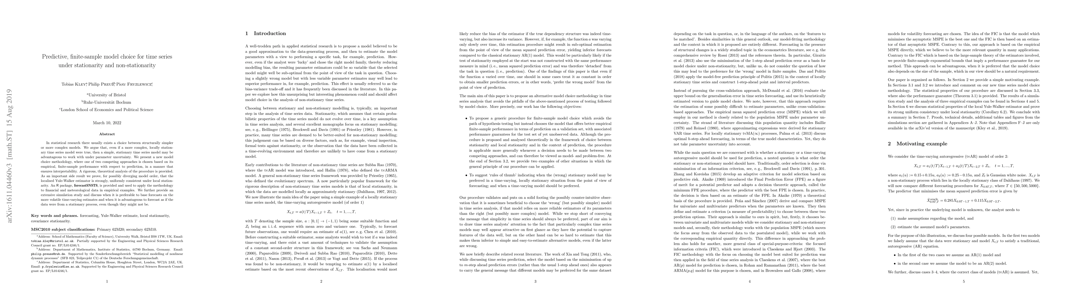A new model choice methodology is presented for time series data under both stationarity and non-stationarity, choosing between simpler and more complex models based on empirical performance and interpretability.