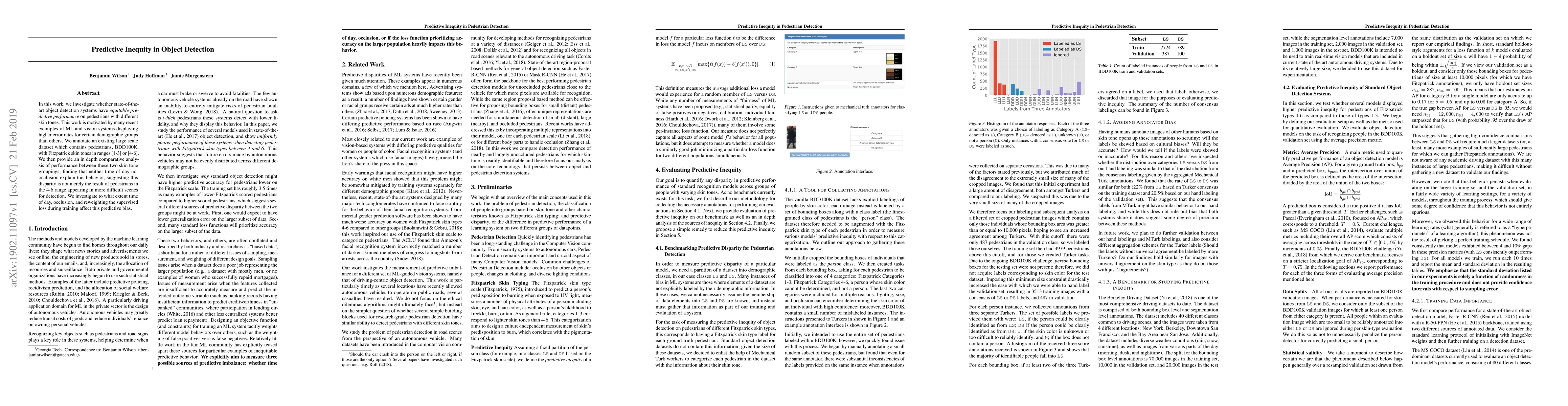 In this work, we investigate whether state-of-the-art object detection systems have equitable predictive performance on pedestrians with different skin tones. This work is motivated by many recent examples of ML and vision systems displaying higher error rates for certain demographic groups than others. We annotate an existing large scale dataset which contains pedestrians, BDD100K, with Fitzpatrick skin tones in ranges [1-3] or [4-6]. We then provide an in-depth comparative analysis of performance between these two skin tone groupings, finding that neither time of day nor occlusion explain this behavior, suggesting this disparity is not merely the result of pedestrians in the 4-6 range appearing in more difficult scenes for detection. We investigate to what extent time of day, occlusion, and reweighting the supervised loss during training affect this predictive bias.