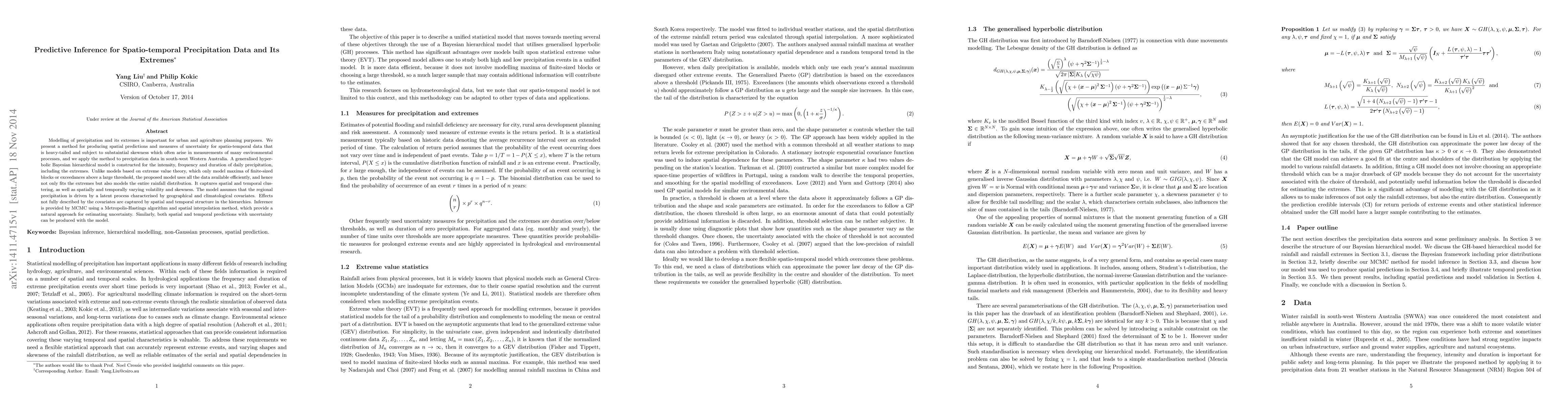 Modelling of precipitation and its extremes is important for urban and agriculture planning purposes. We present a method for producing spatial predictions and measures of uncertainty for spatio-temporal data that is heavy-tailed and subject to substaintial skewness which often arise in measurements of many environmental processes, and we apply the method to precipitation data in south-west Western Australia. A generalised hyperbolic Bayesian hierarchical model is constructed for the intensity, frequency and duration of daily precipitation, including the extremes. Unlike models based on extreme value theory, which only model maxima of finite-sized blocks or exceedances above a large threshold, the proposed model uses all the data available efficiently, and hence not only fits the extremes but also models the entire rainfall distribution. It captures spatial and temporal clustering, as well as spatially and temporally varying volatility and skewness. The model assumes that the regional precipitation is driven by a latent process characterised by geographical and climatological covariates. Effects not fully described by the covariates are captured by spatial and temporal structure in the hierarchies. Inference is provided by MCMC using a Metropolis-Hastings algorithm and spatial interpolation method, which provide a natural approach for estimating uncertainty. Similarly both spatial and temporal predictions with uncertainty can be produced with the model.